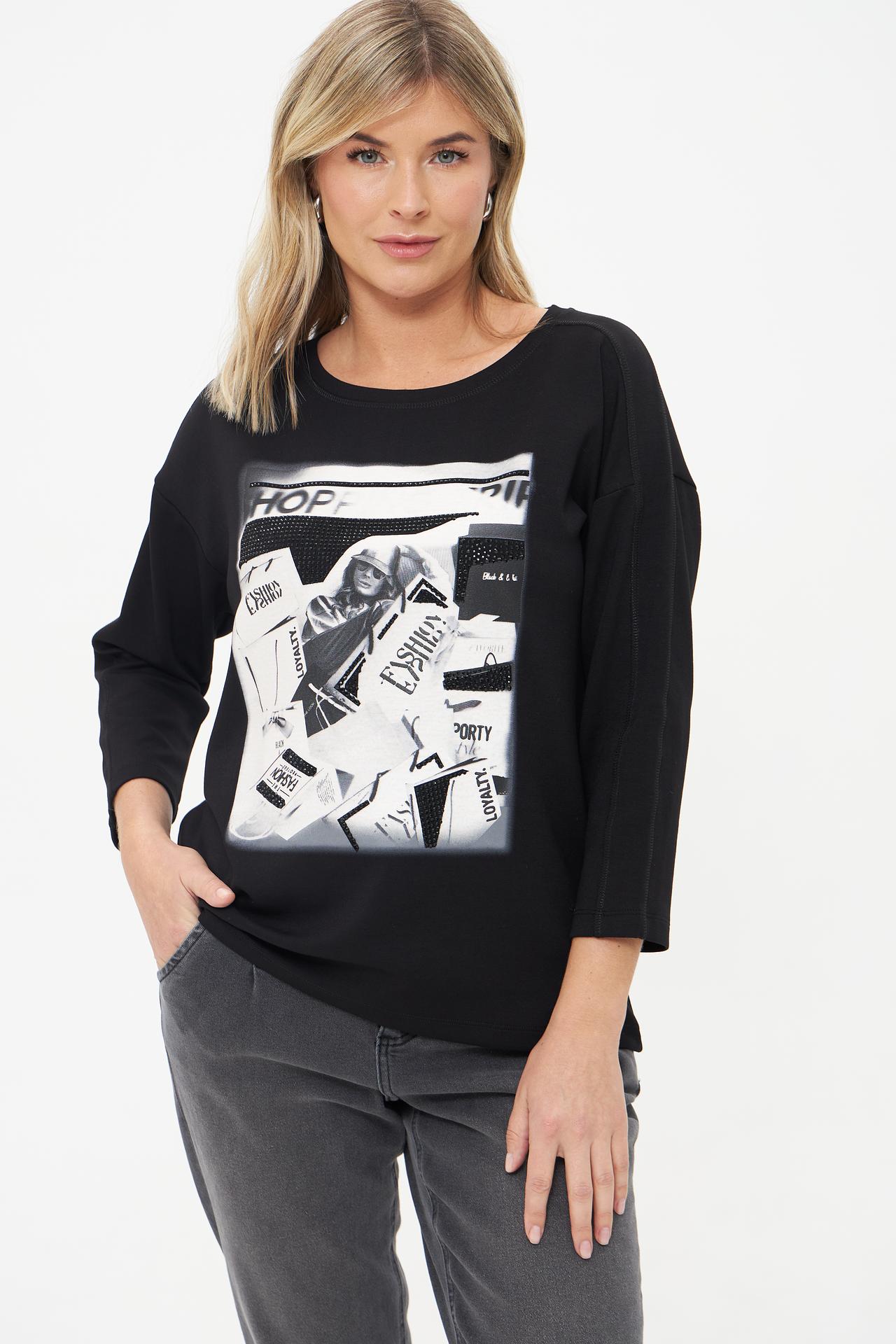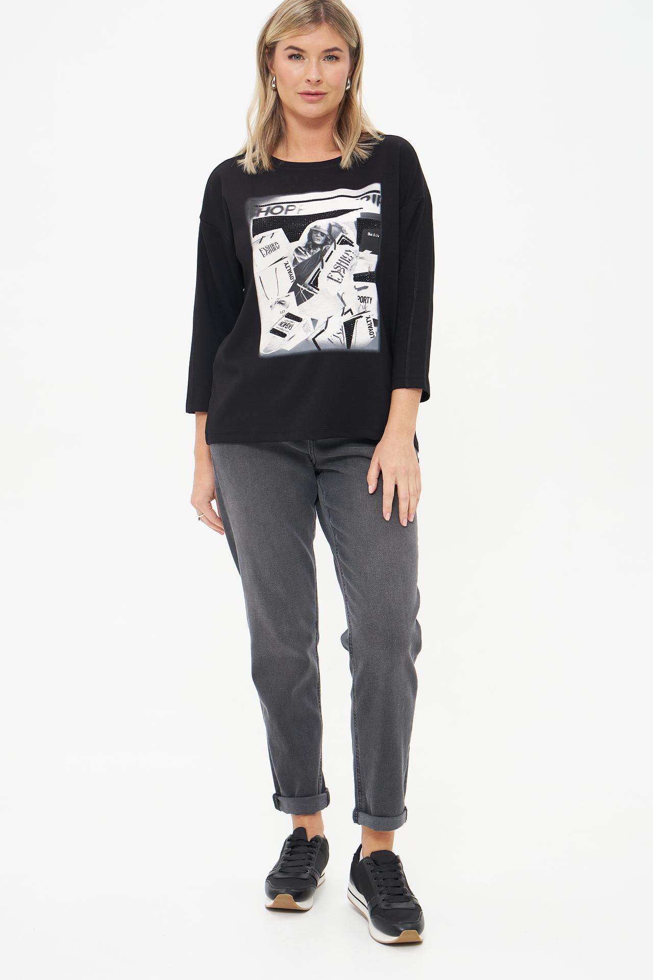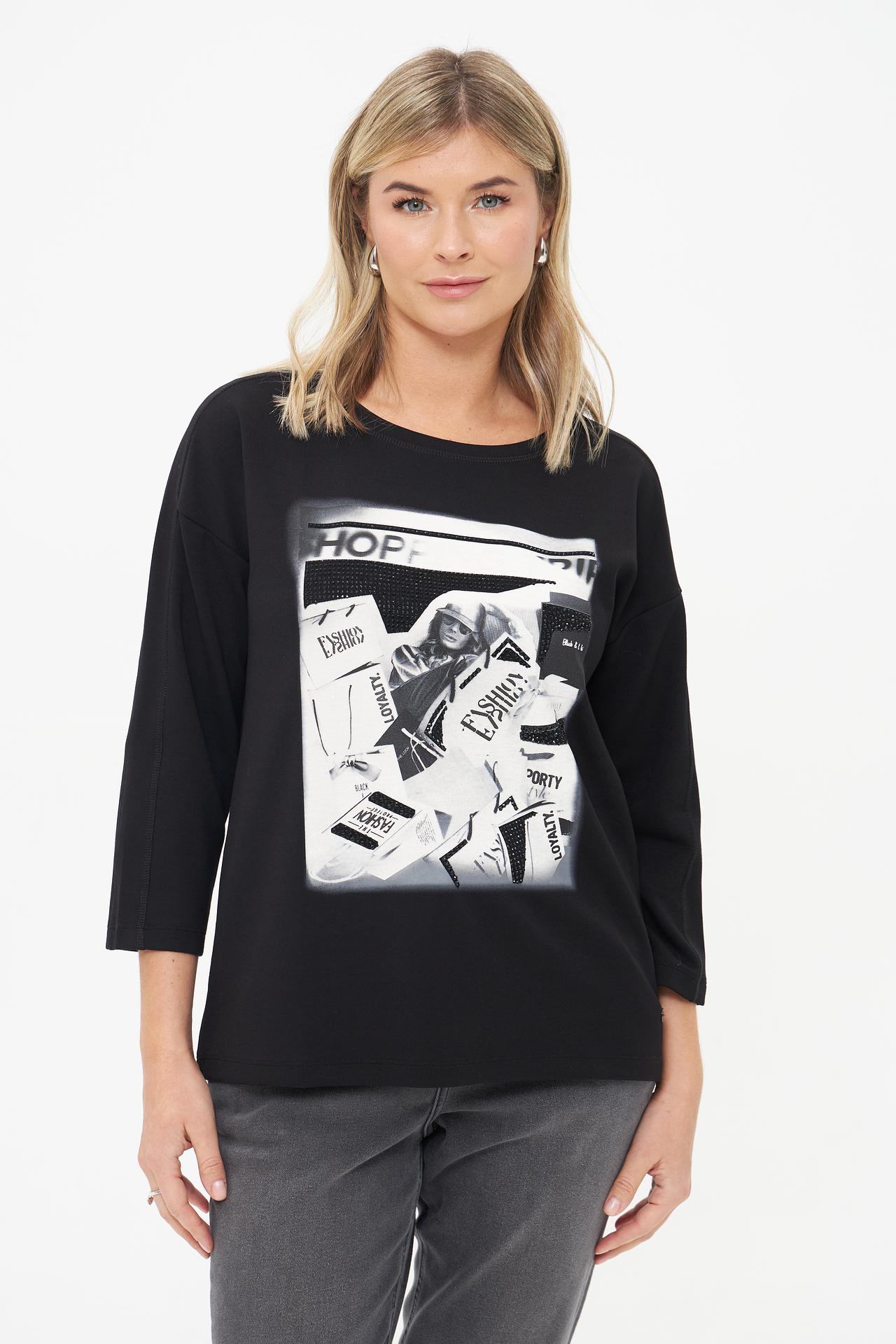 Элегантная футболка Monari чёрного цвета станет основой вашего модного образа. Модель свободного кроя с рукавами длиной 3/4 дополнена эффектным принтом в стиле коллаж, украшенным мерцающими стразами. Этот элемент придает футболке особый шик и привлекает внимание.