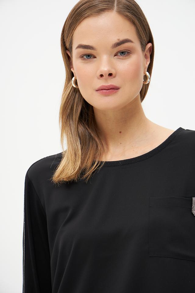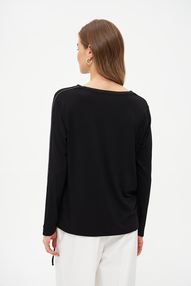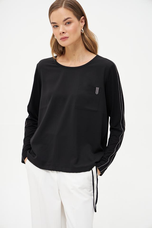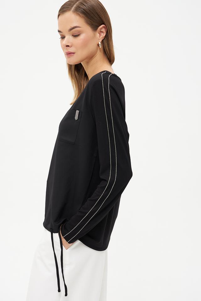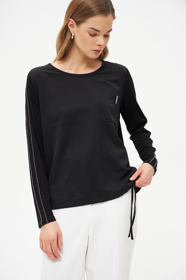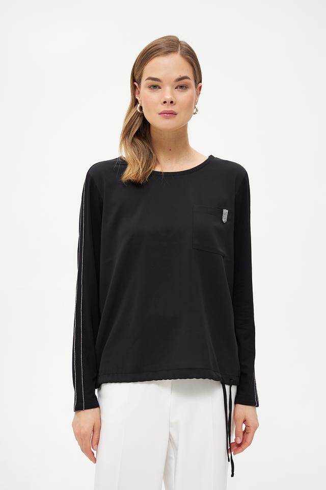 Чёрная блуза Monari с длинными рукавами и контрастной полоской. Изготовлена из мягкой ткани с добавлением вискозы, имеет удобную посадку и декоративный карман на груди. Состав: полиэстер 100%, Состав_2 вискоза 92%, Состав_2 эластан 8%