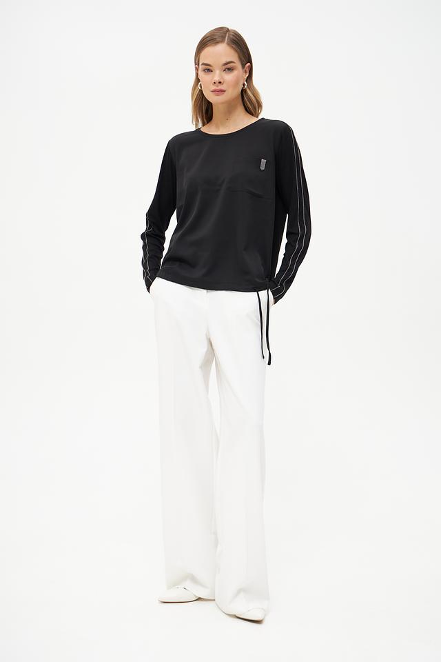 Блуза имеет прямой крой, круглый вырез горловины и длинные рукава, украшенные контрастной полоской. На груди расположен накладной карман с декоративной отделкой.