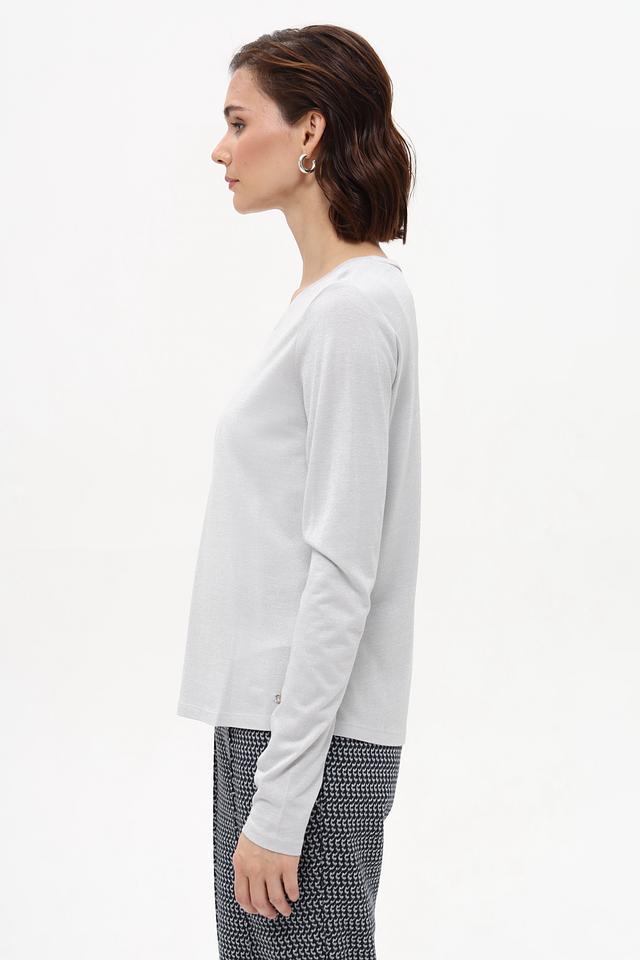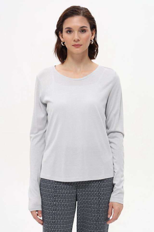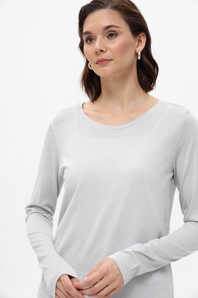 Серый цвет футболки делает ее универсальной и подходящей для создания самых разных образов. Ткань обладает легким блеском благодаря содержанию метализированного полиэстера, что придает изделию изысканность. Эта футболка идеально подойдет для повседневной носки, а также для создания более элегантных образов.