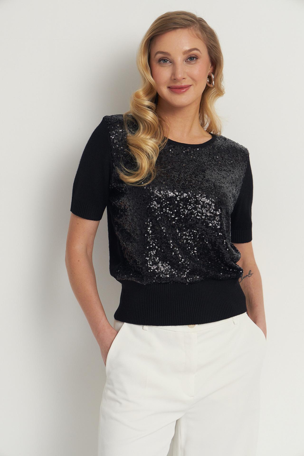 - Дизайн: Сочетание классического черного цвета и сверкающих пайеток делает этот пуловер универсальным решением для создания как дневных, так и вечерних образов. Идеально подходит для особых случаев или когда хочется добавить немного праздника в повседневность.