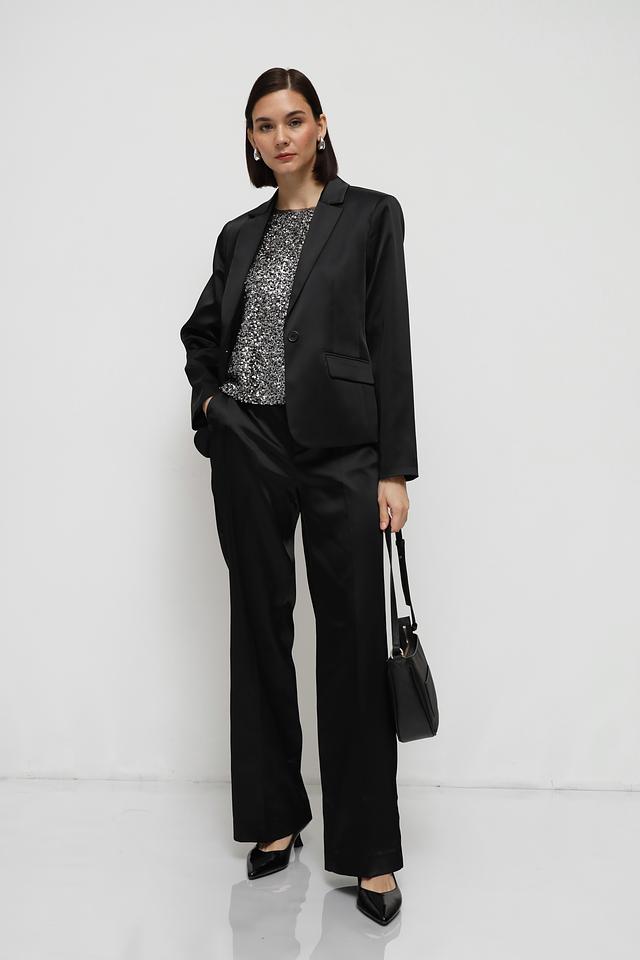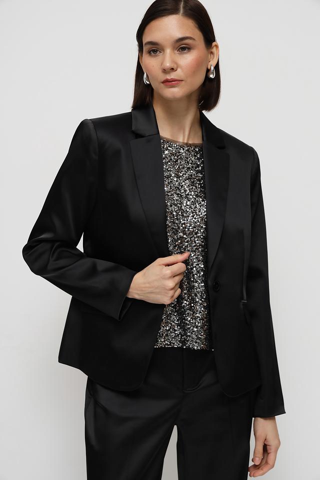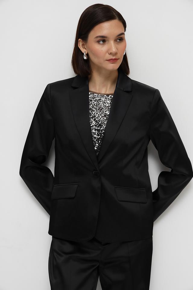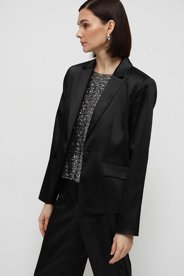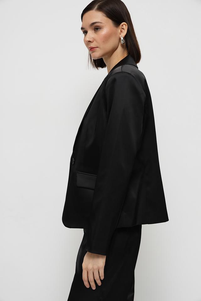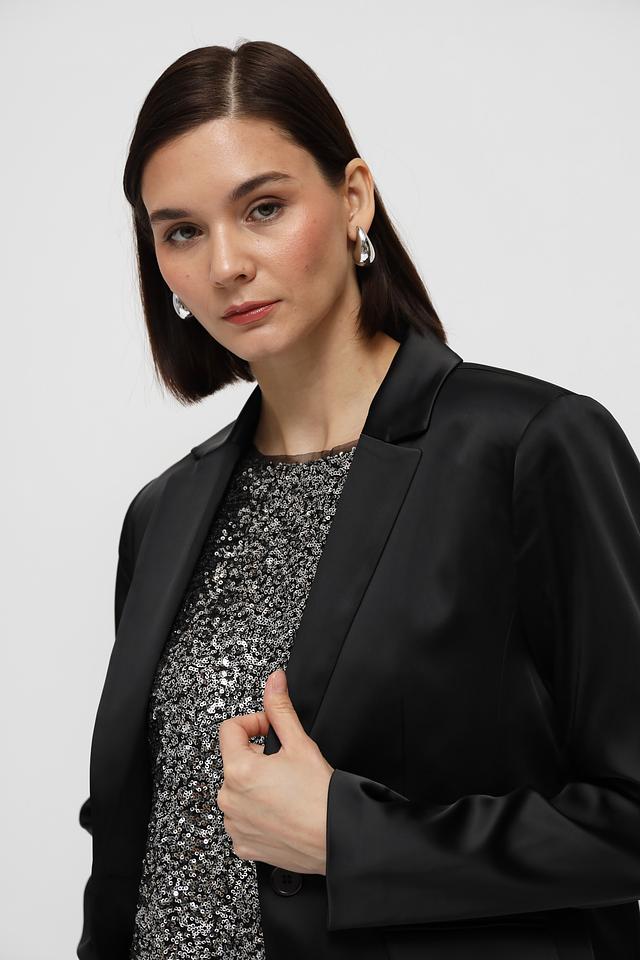 Жакет имеет классический крой с лацканами и застежкой на одну пуговицу. Прямые линии и минималистичный дизайн делают его подходящим для различных стилей и случаев.
