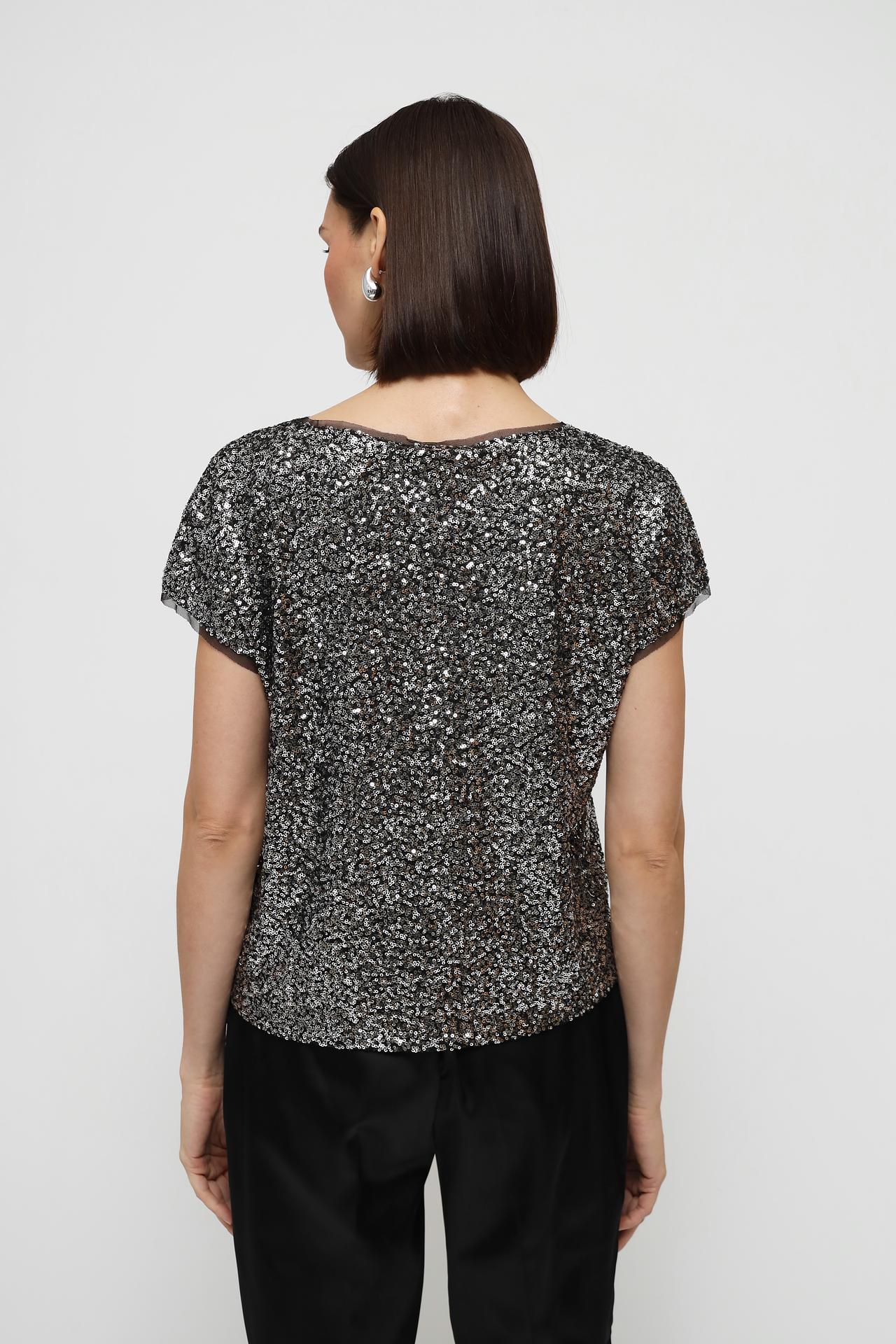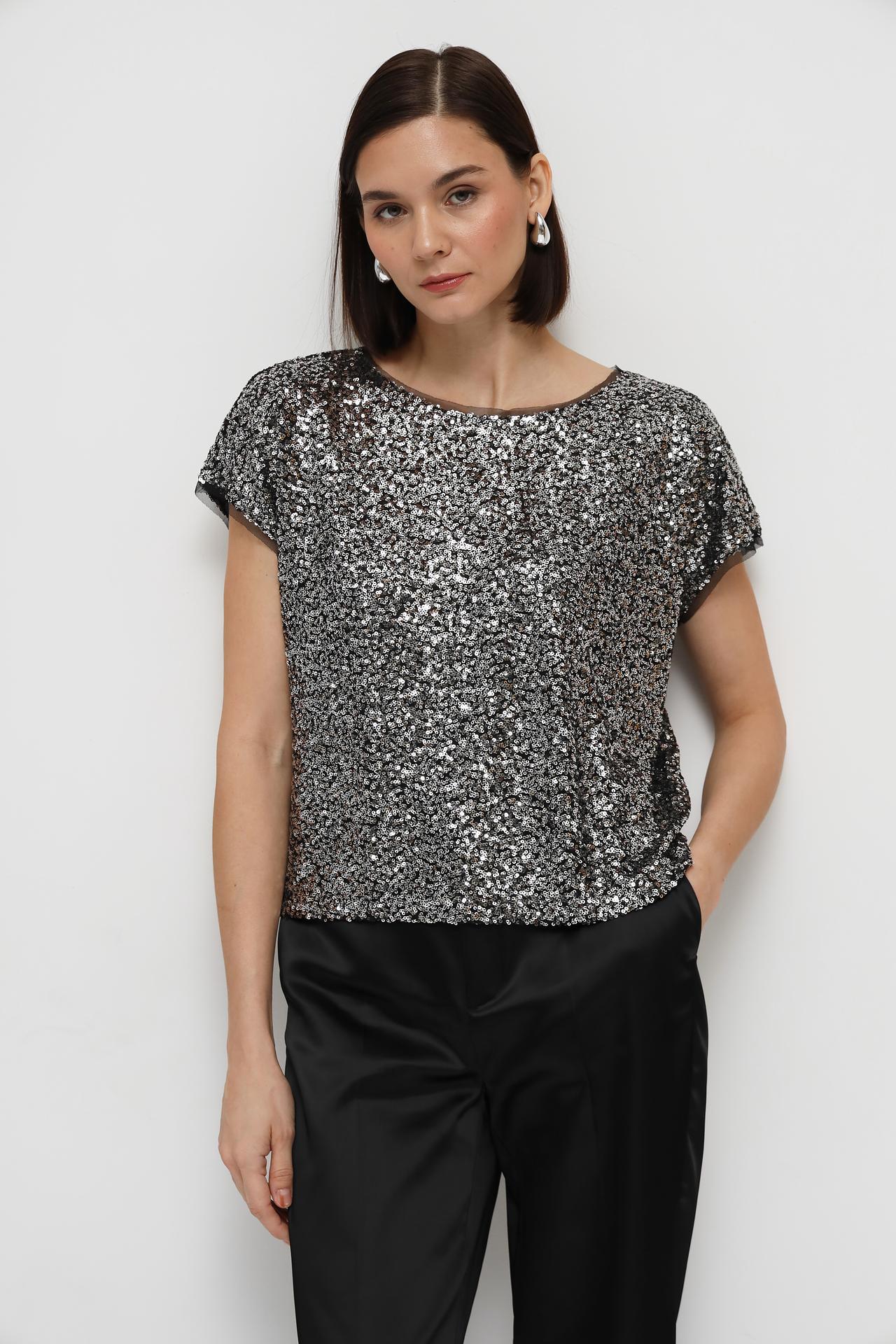 Эта блузка идеально подходит для вечеринок, праздников и других особых случаев. Модель украшена пайетками серебряного цвета, которые придают ей блеск и привлекательность, делая образ неповторимым.