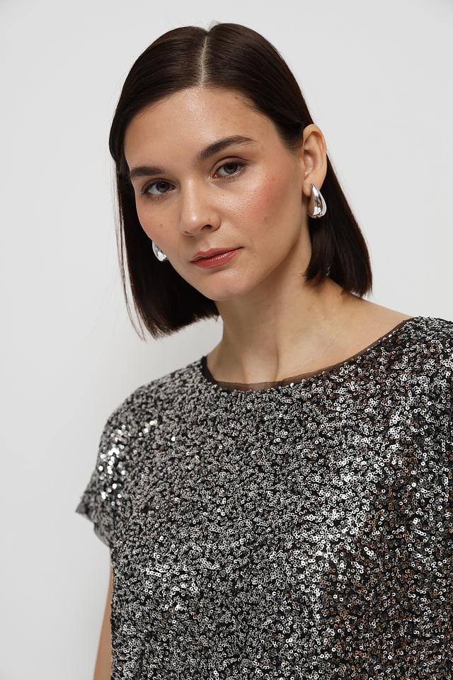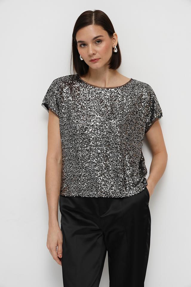 Блузка Monari серебристого цвета, полностью расшита пайетками, создавая эффектный и праздничный образ. Модель с короткими рукавами и округлым вырезом горловины станет отличным дополнением к вечернему гардеробу. Состав: полиэстер 100%