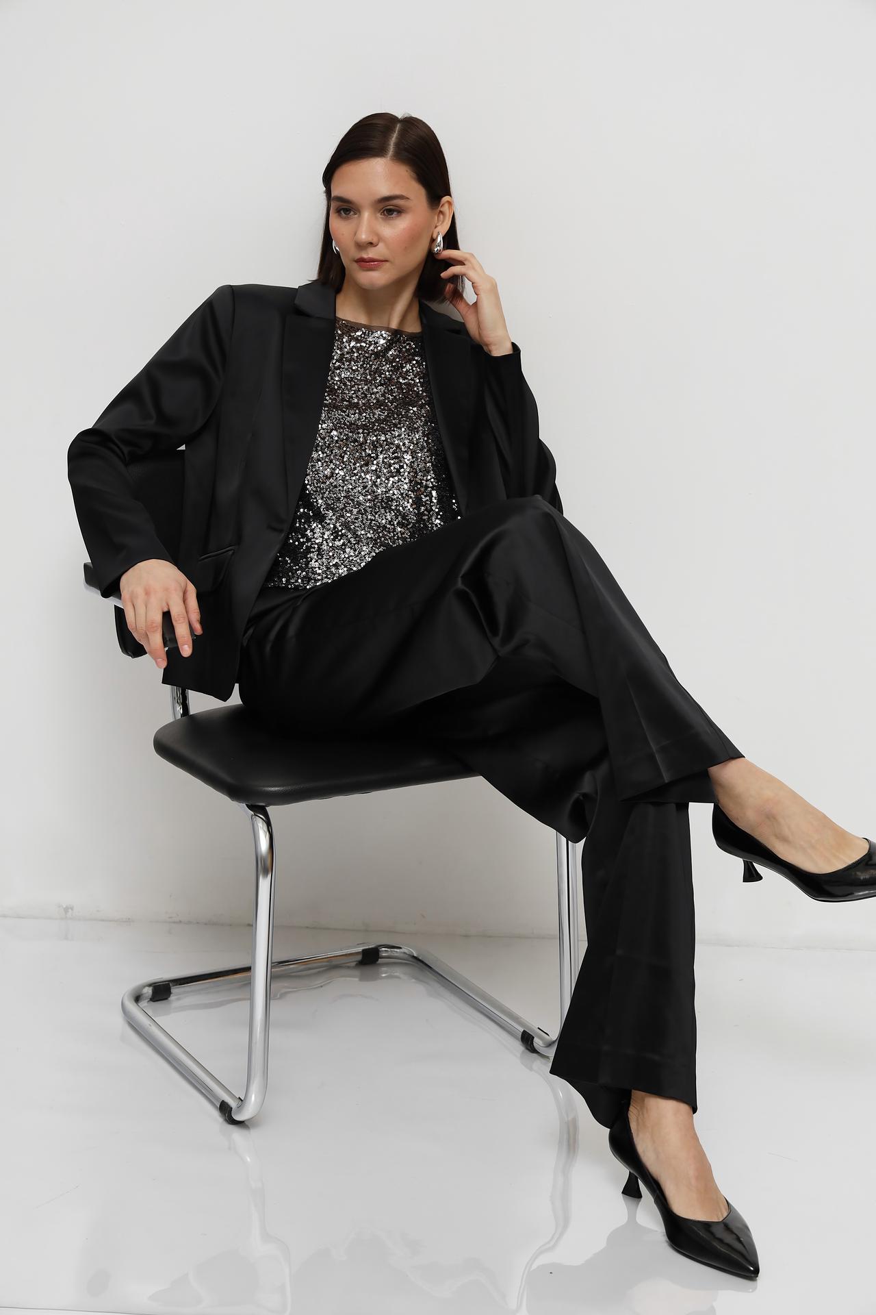 - Декор: Блуза украшена серебристыми пайетками, добавляющими образу изысканности.