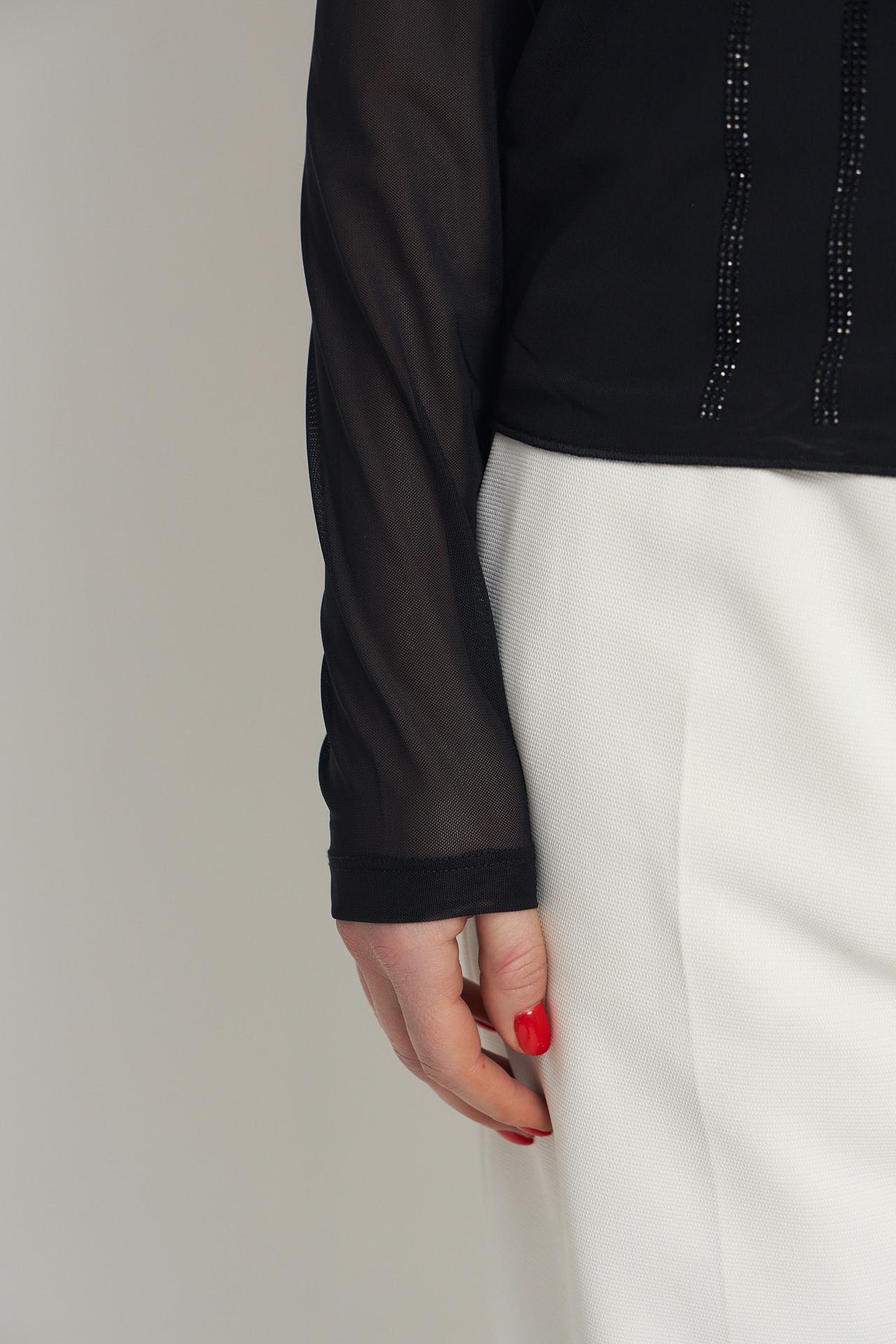 - Дизайн: Водолазка имеет классический силуэт с высоким воротником и длинными рукавами. Передняя часть украшена вертикальными полосами декоративных элементов, создающих мерцающий эффект.