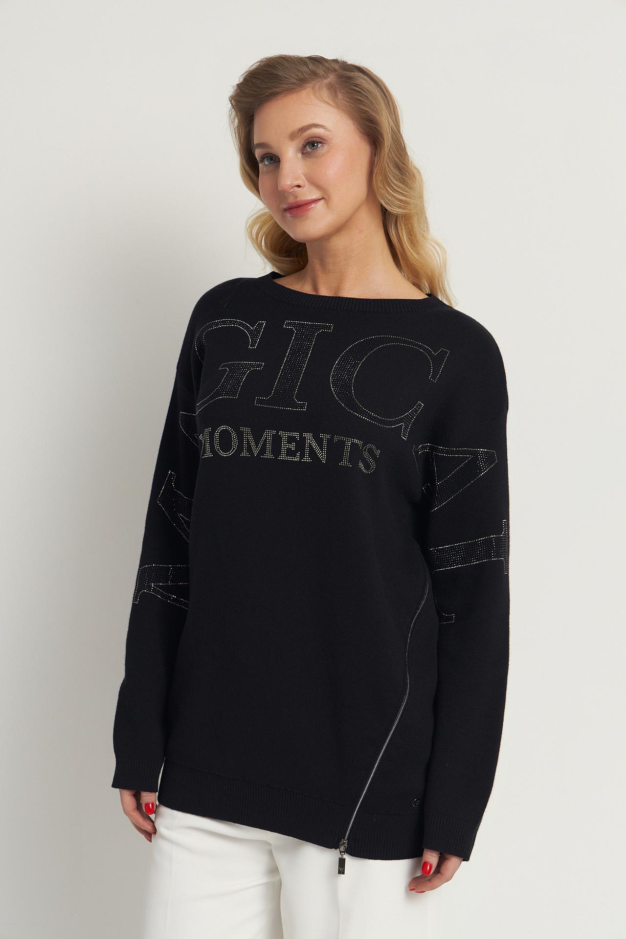 - Дизайн: Классический крой с круглым вырезом и длинными рукавами. Декоративные надписи, выполненные сверкающими стразами, придают изделию изысканность и оригинальность. Асимметричная застежка-молния на боковом шве добавляет акцент и позволяет регулировать посадку.