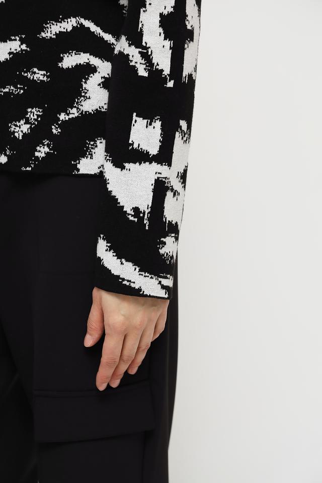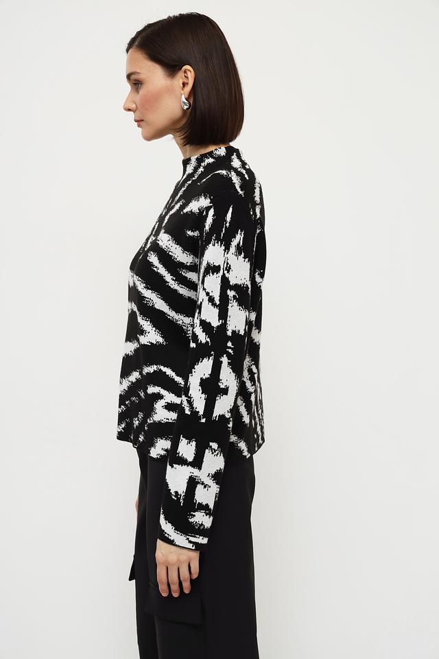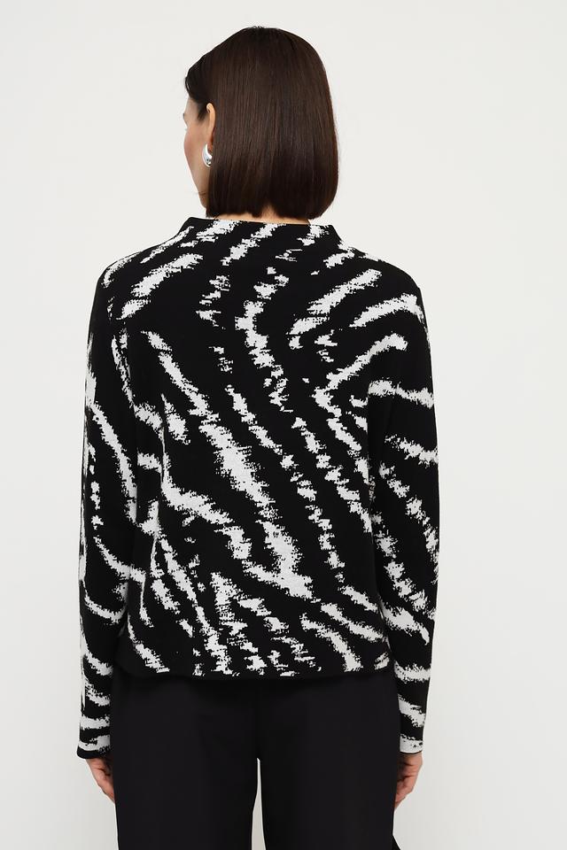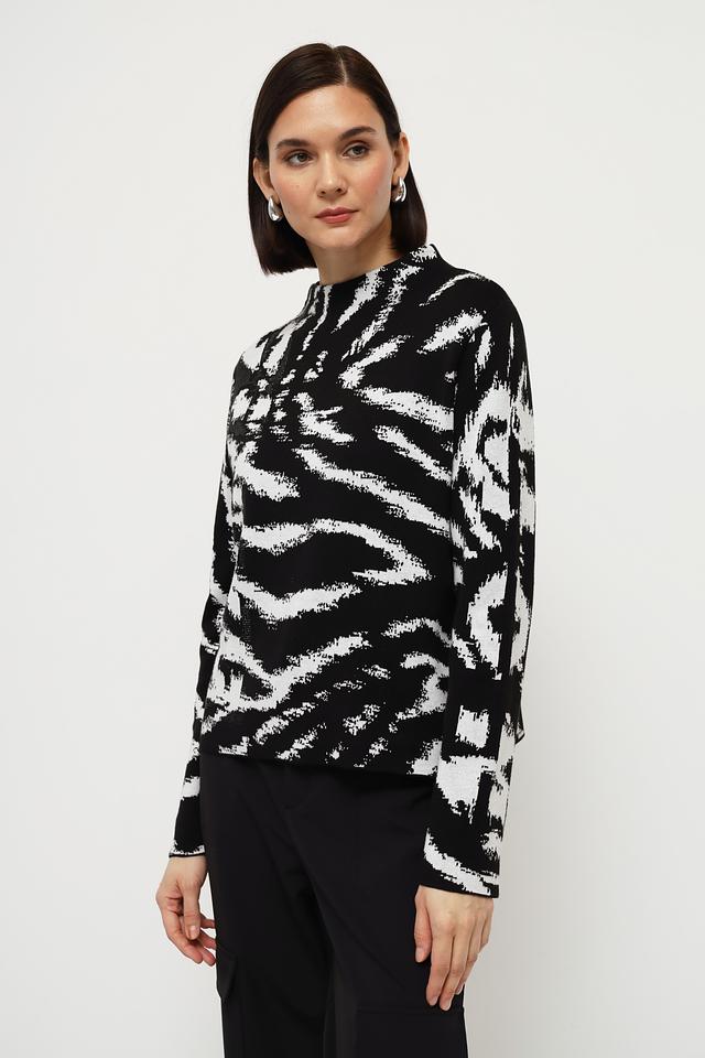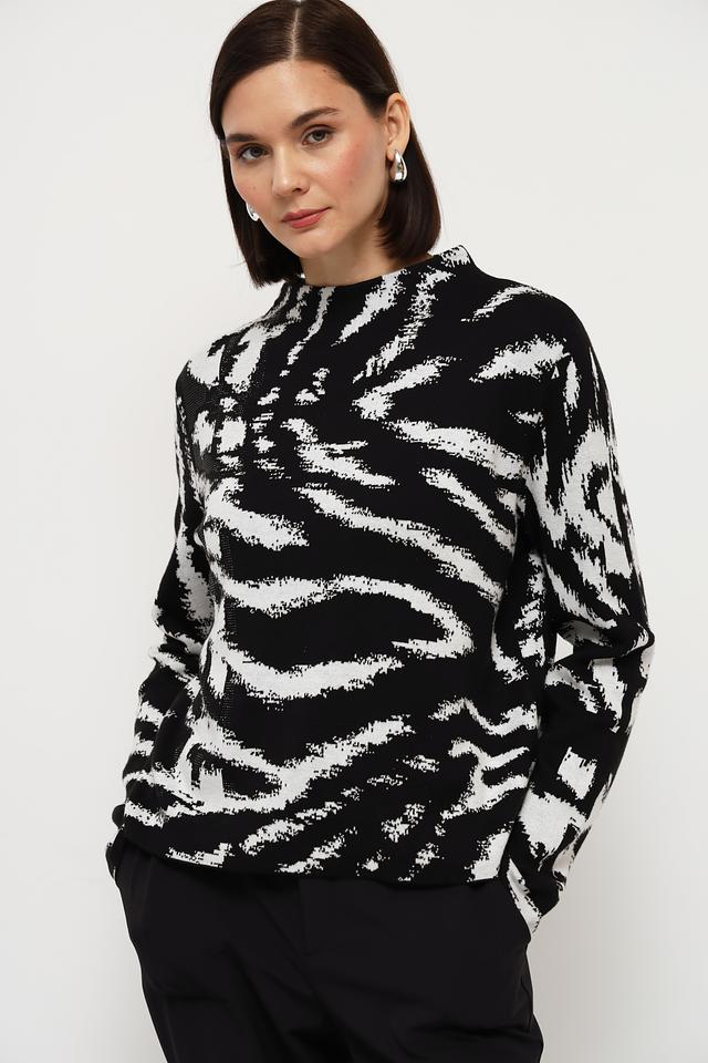 Этот стильный пуловер от Monari выполнен в актуальном дизайне с принтом, имитирующим шкуру зебры. Преобладающий цвет – чёрный, дополненный яркими белыми полосами, создающими эффектный контраст.