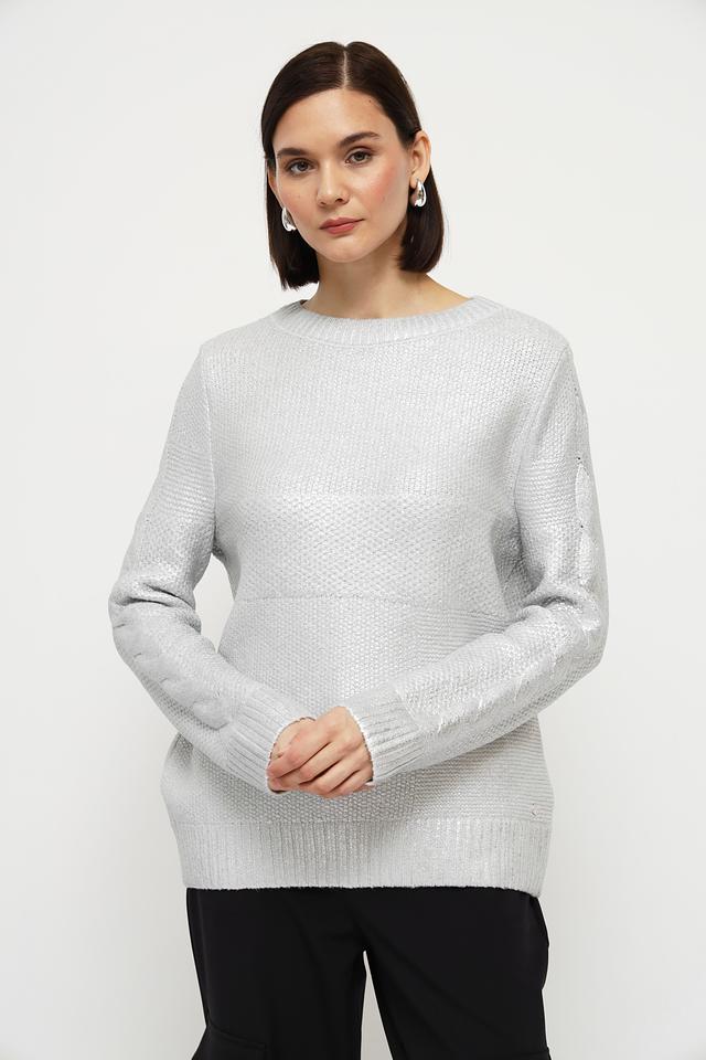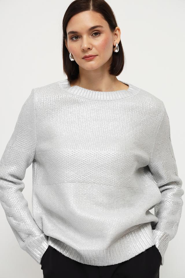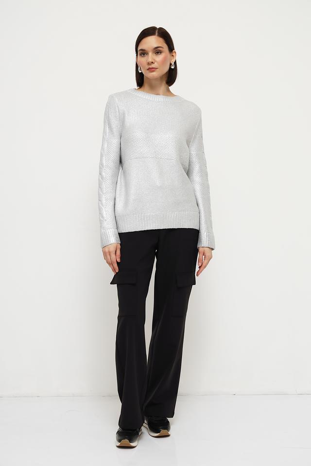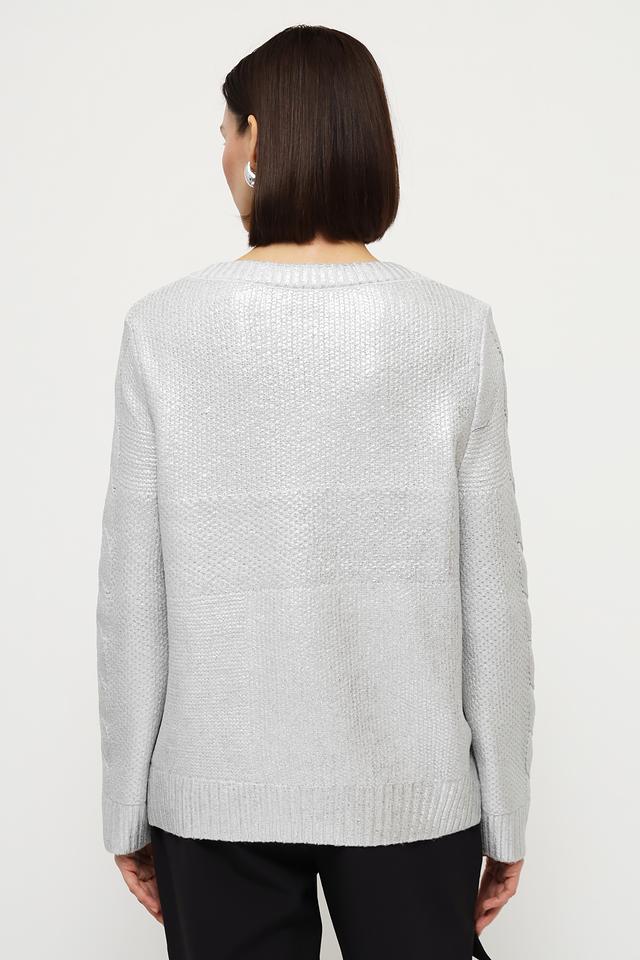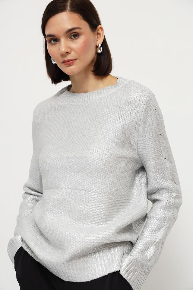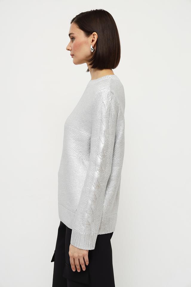 Пуловер имеет свободный крой и круглый вырез горловины. Его серебристый цвет и необычная фактура, напоминающая лёгкий блеск, делают его особенным и привлекательным. Рукава выполнены с выразительным узором, добавляющим изделию изысканности.