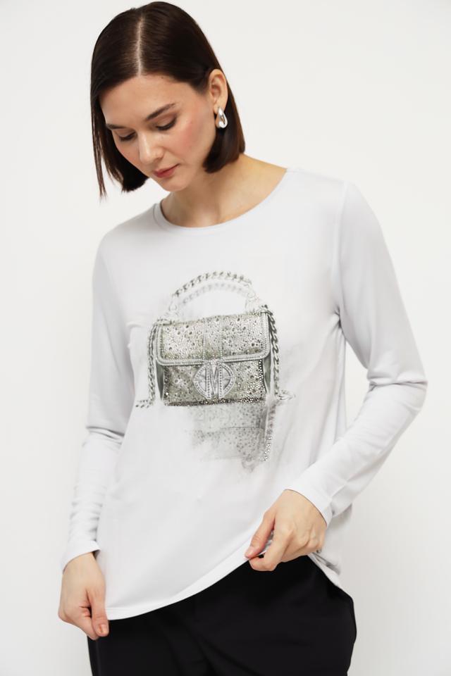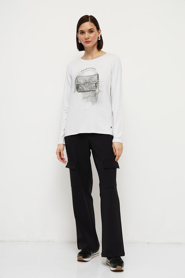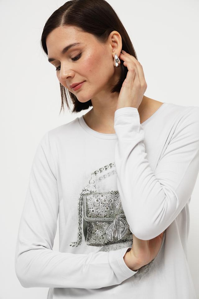 Белый лонгслив Monari с оригинальным принтом сумки. Изготовлен из мягкой и приятной к телу ткани на основе вискозы, модала и эластана. Состав: вискоза 45%, модал 45%, эластан 10%