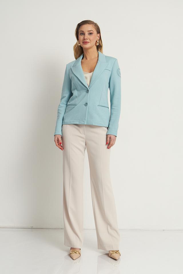Жакет застегивается на две пуговицы в тон ткани. Отличительной особенностью модели являются лацканы классической формы и аккуратные боковые карманы с клапанами. На спине расположен небольшой декоративный элемент.