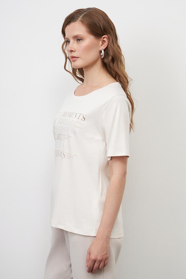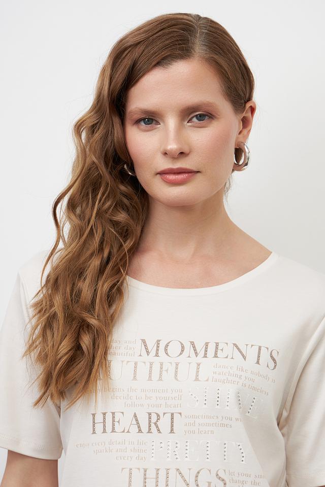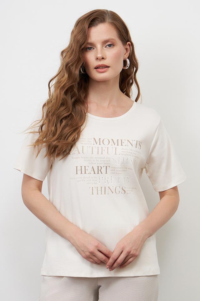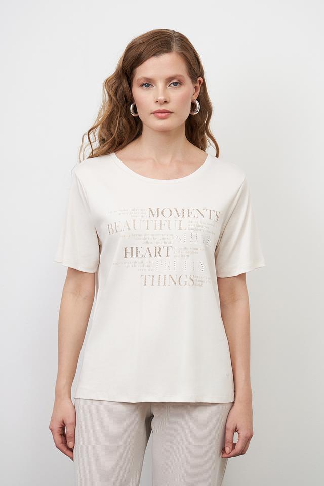 Женская футболка Monari кремового цвета с оригинальным принтом "Moments, Beautiful Heart, Things". Изготовлена из мягкого хлопка, обеспечивающего комфорт в носке. Стильный и лаконичный дизайн. Состав: хлопок 100%