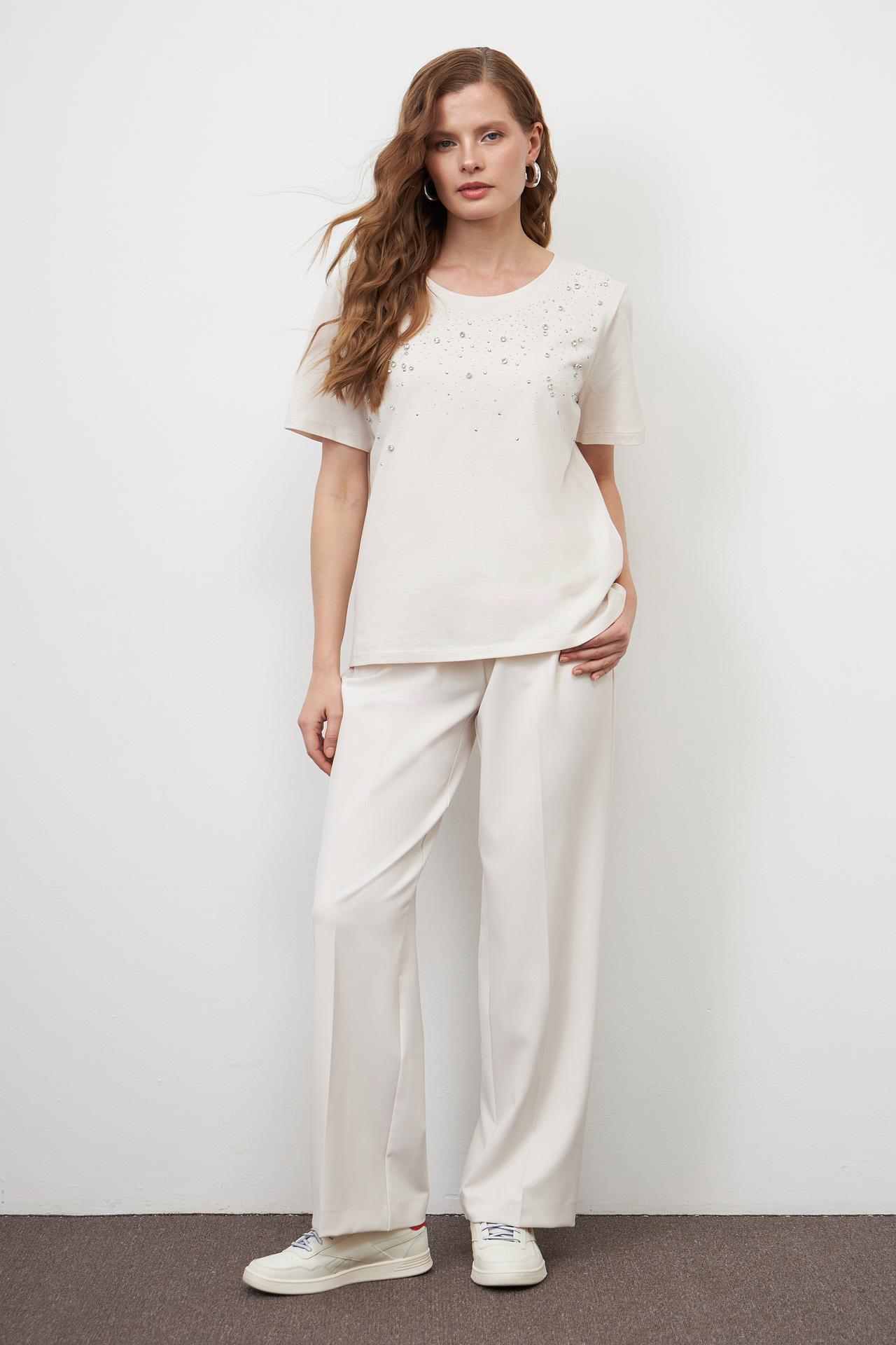 - Изысканный декор: Передняя часть футболки украшена россыпью страз и бусин различного размера, создающих утонченный и блестящий акцент. Декоративные элементы добавляют изделию праздничности и оригинальности, позволяя создать как повседневный, так и вечерний образ.