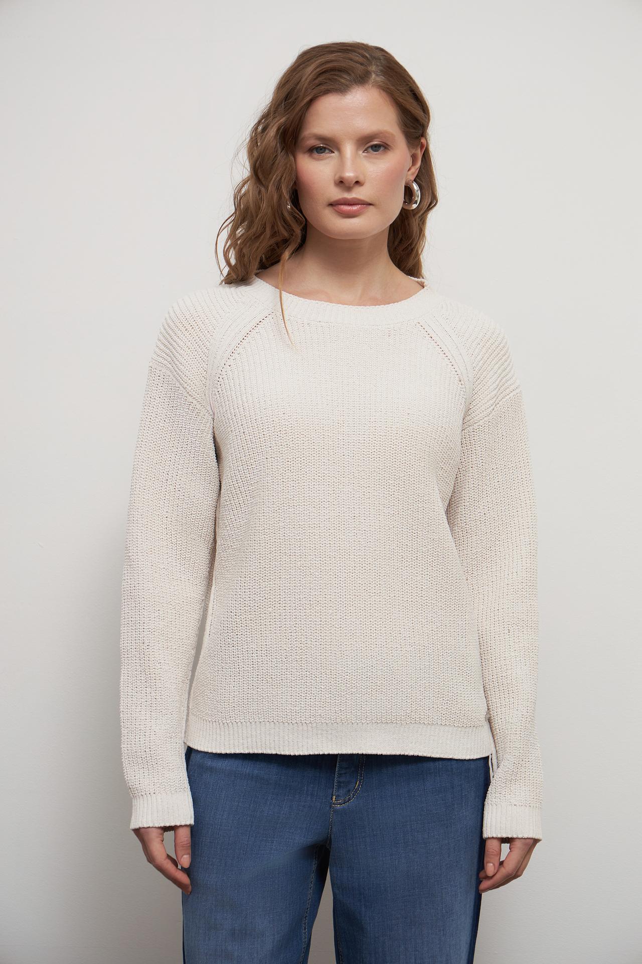 - Классический дизайн: Модель имеет прямой крой, классический круглый вырез и длинные рукава, что делает ее универсальной для различных типов фигур. Аккуратная фактурная вязка добавляет изделию шарма и делает его визуально интереснее.