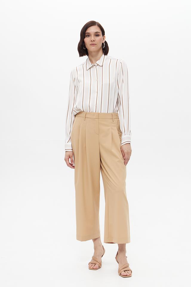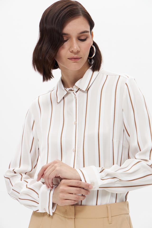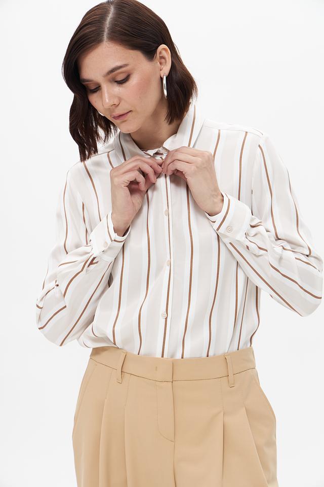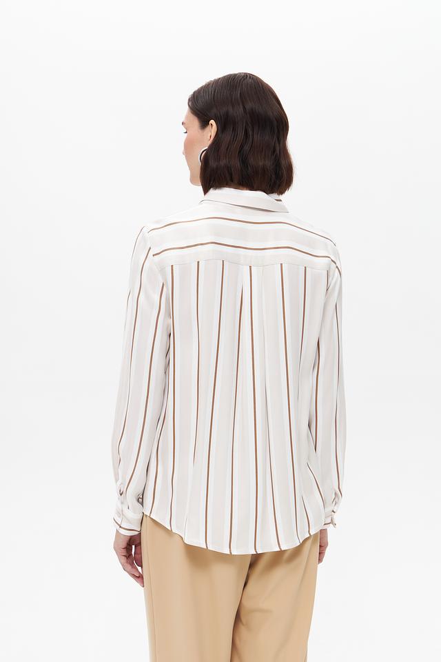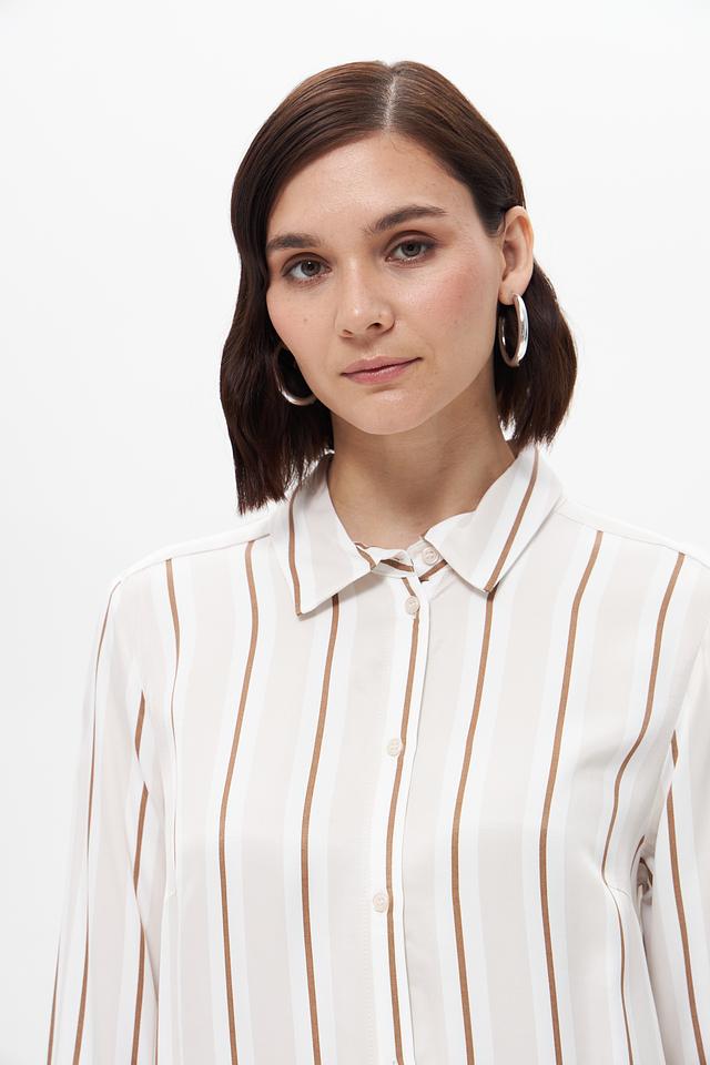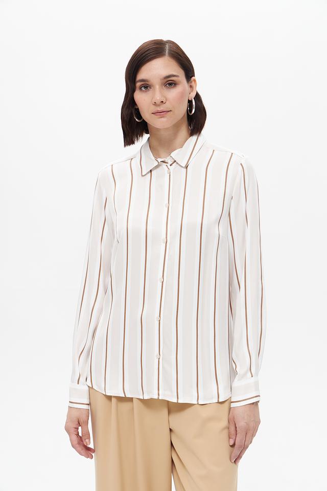 Блуза имеет классический крой с длинными рукавами и отложным воротником. Вертикальная полоска в бежевых и кремовых тонах визуально вытягивает силуэт и придает образу элегантность.