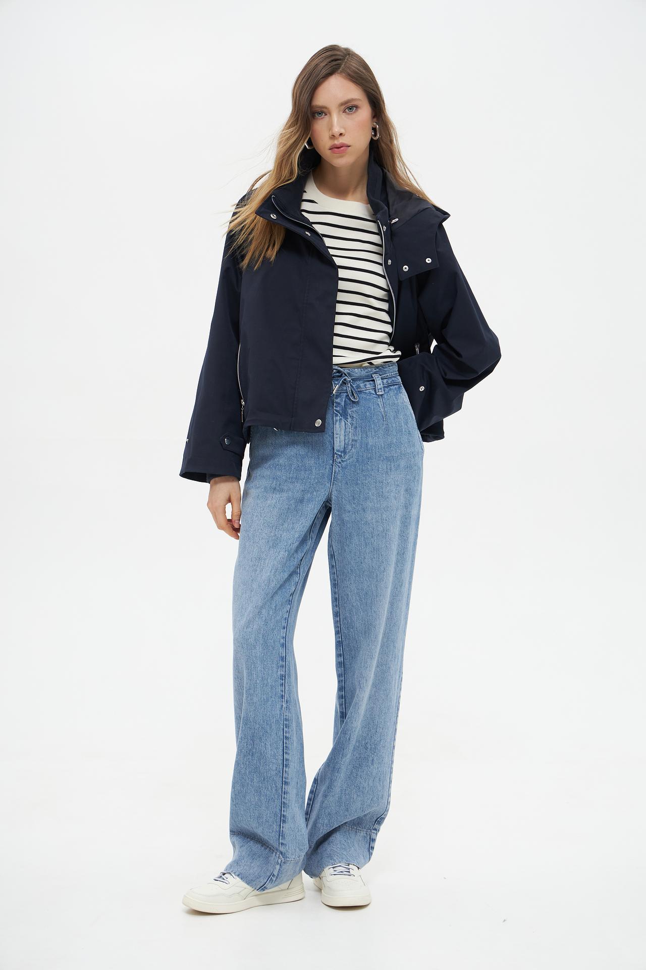 - Цвет: Светло-голубой деним с эффектом потертости добавляет образу непринужденности.