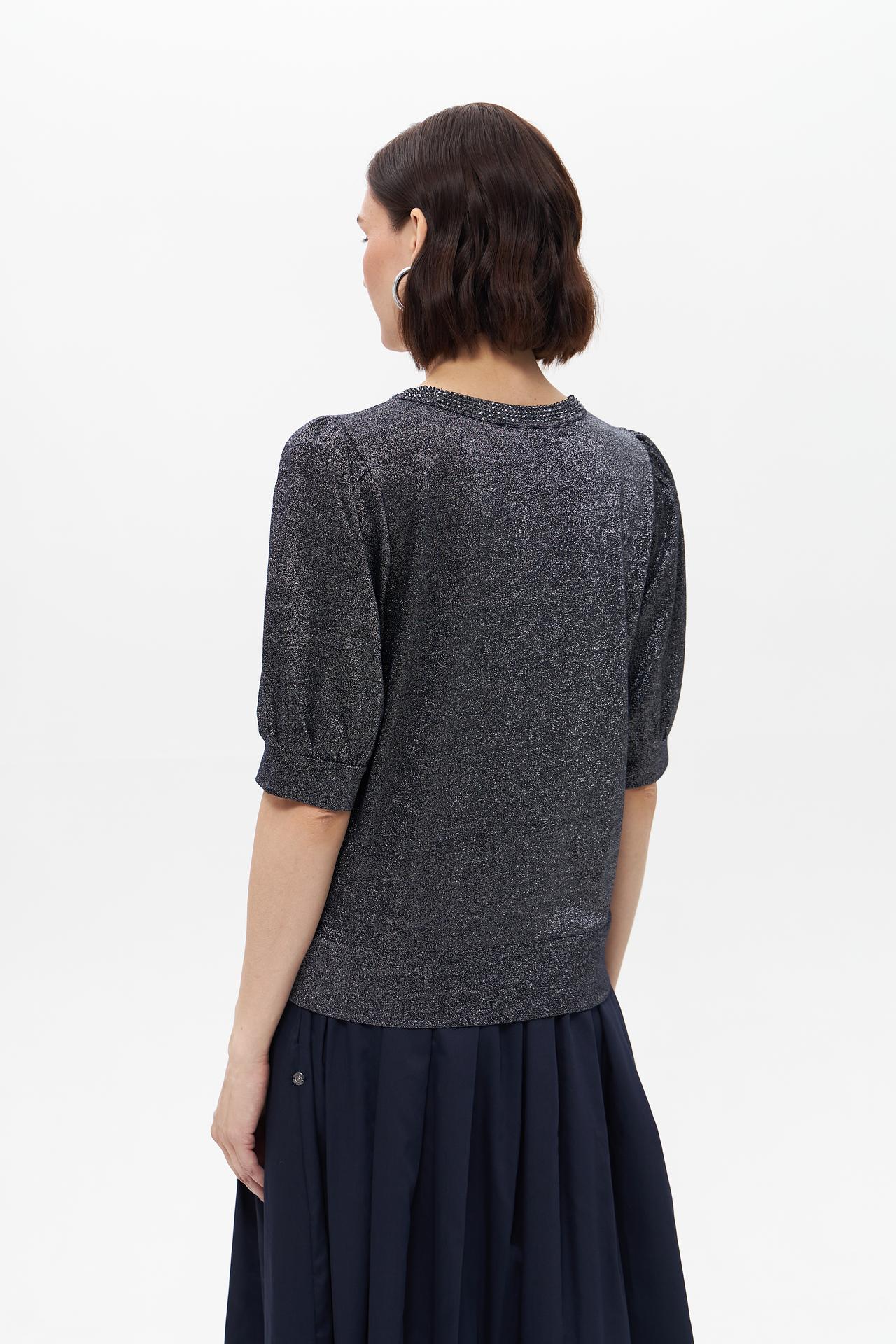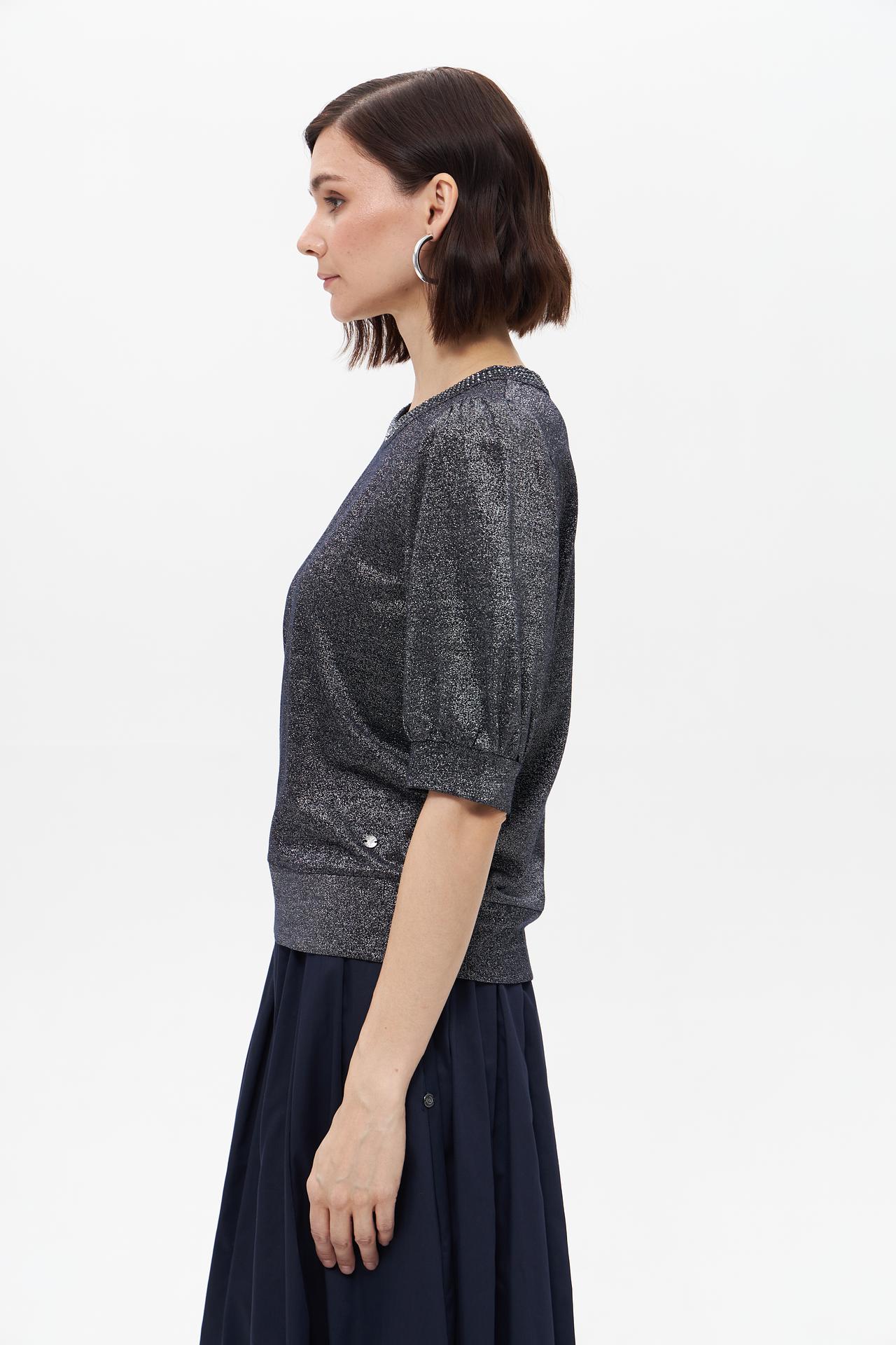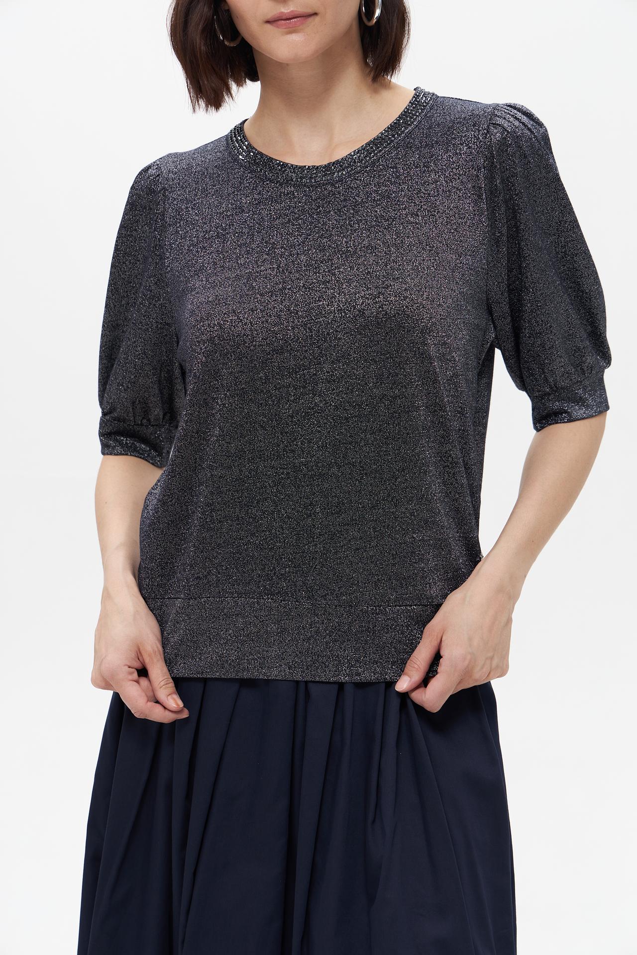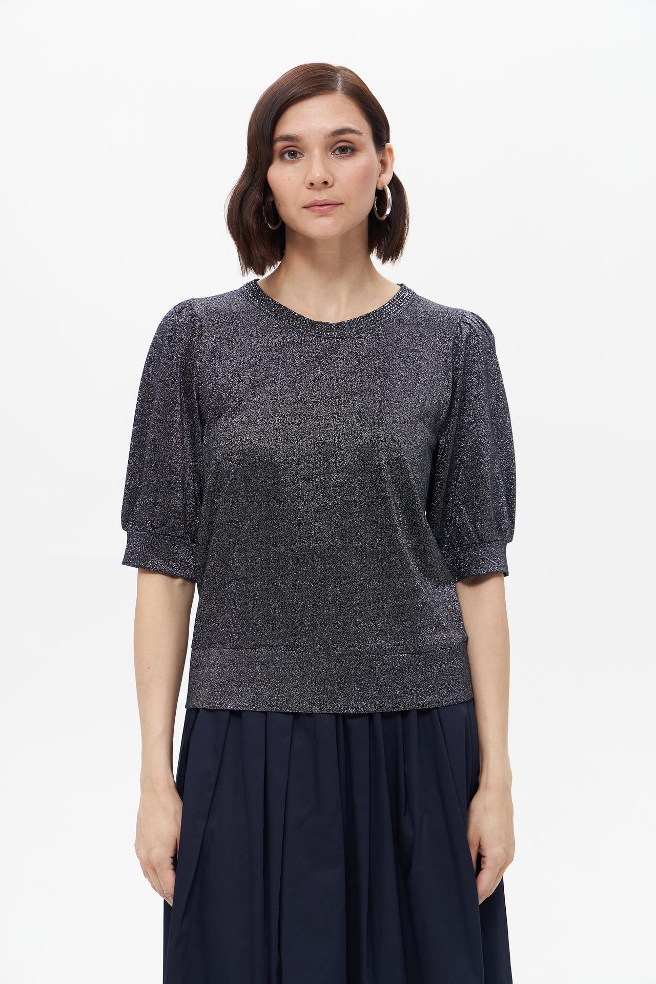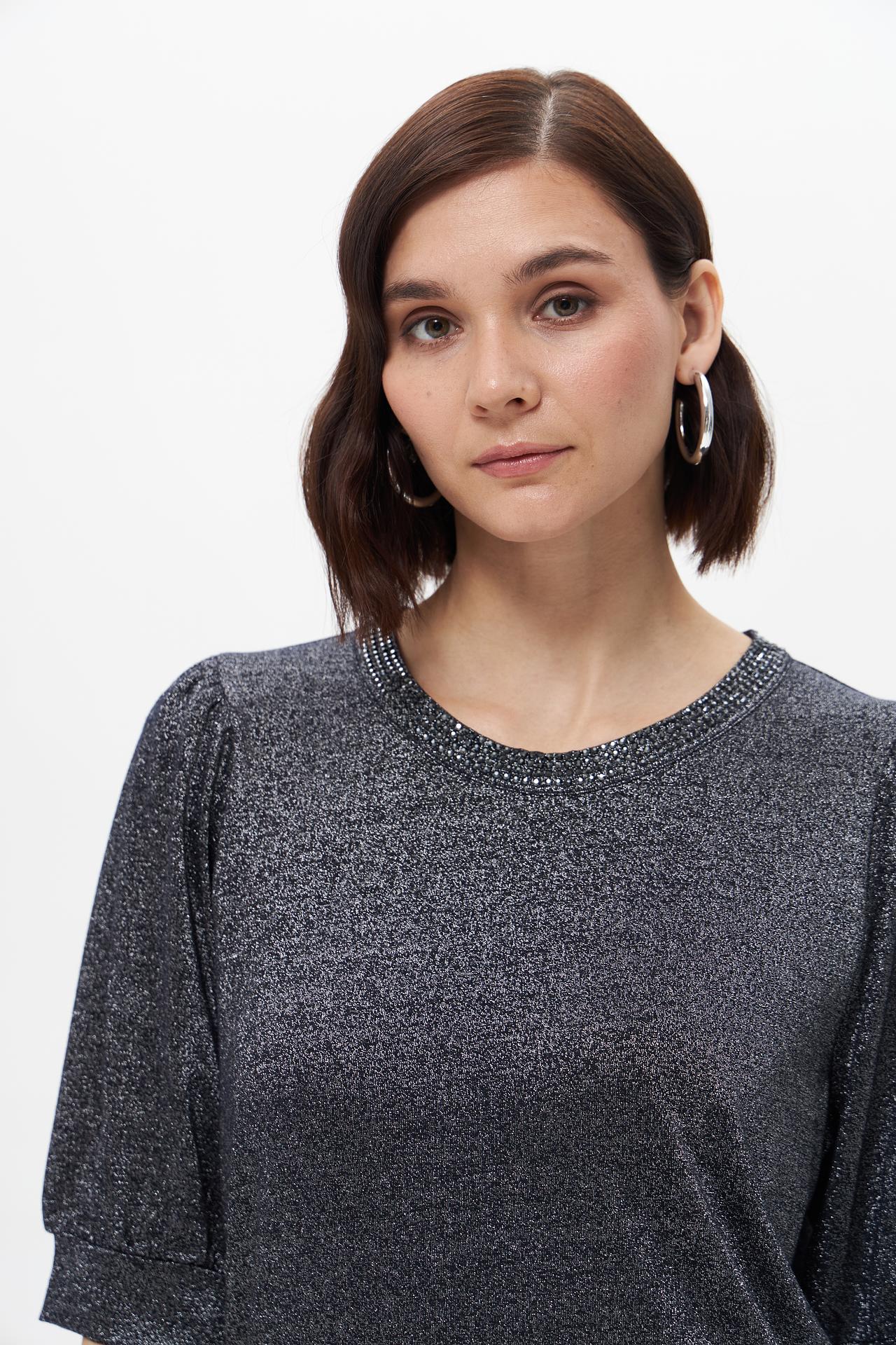 - Дизайн и крой: Футболка имеет приталенный силуэт и короткие рукава-фонарики, которые придают женственности. Круглый вырез горловины отделан мерцающим декором, привлекающим внимание.