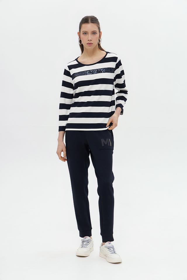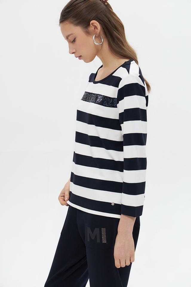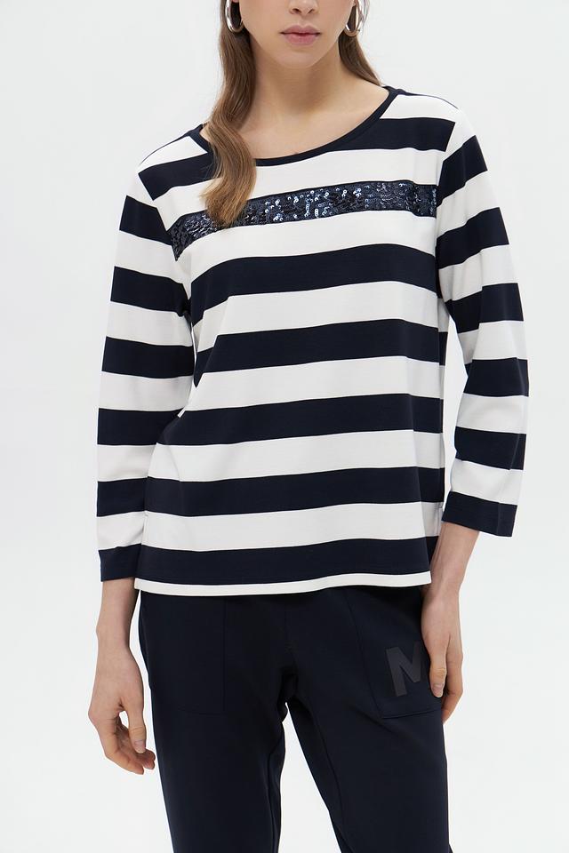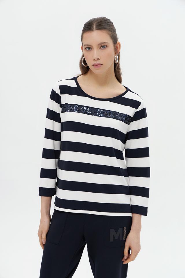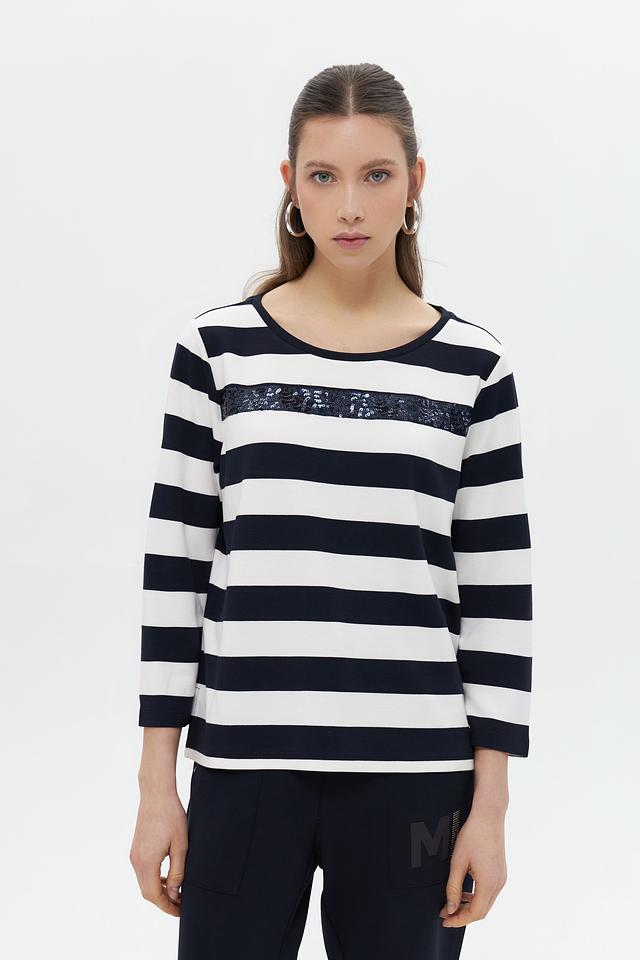 Женский лонгслив Monari сине-белого цвета с полосатым принтом и отделкой из пайеток. Модель с длинными рукавами и круглым вырезом горловины станет стильным дополнением к вашему гардеробу. Состав: вискоза 80%, полиэстер 15%, эластан 5%