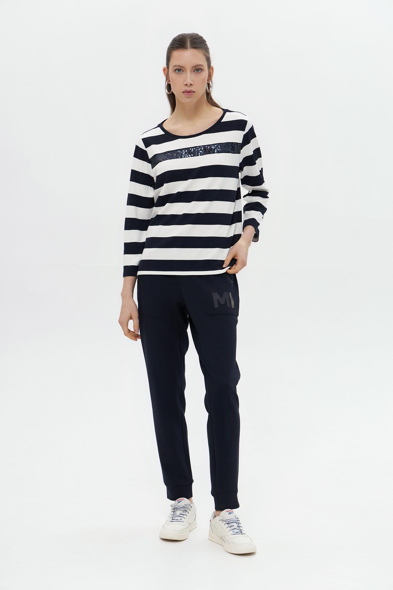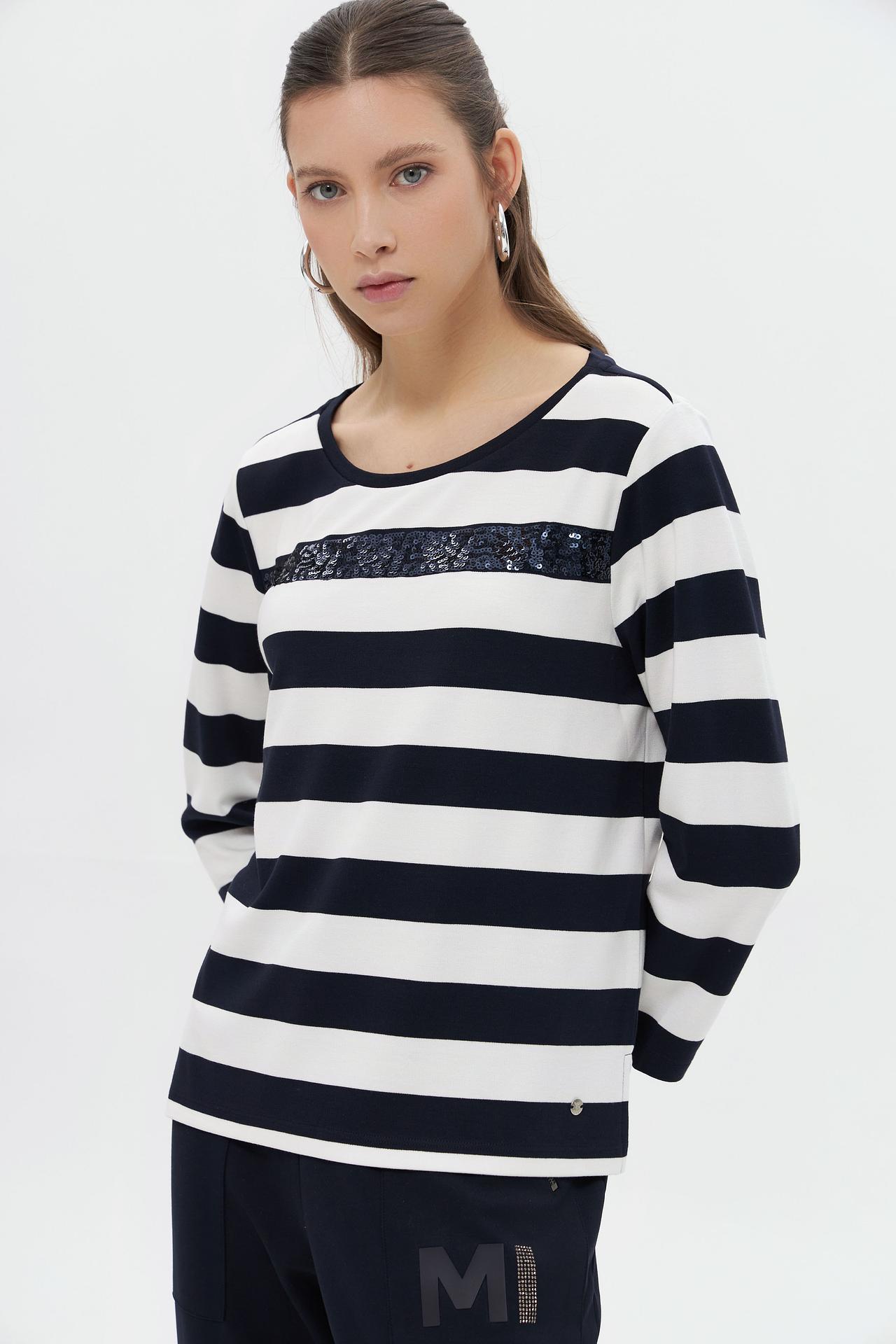 Лонгслив женский Monari в классическую горизонтальную полоску – идеальный выбор для создания стильного и комфортного повседневного образа. Модель выполнена из высококачественного трикотажа, в составе которого 80% вискозы, 15% полиэстера и 5% эластана, что обеспечивает изделию мягкость, эластичность и долговечность. Круглый вырез горловины и рукав 3/4 делают этот лонгслив универсальным элементом гардероба.