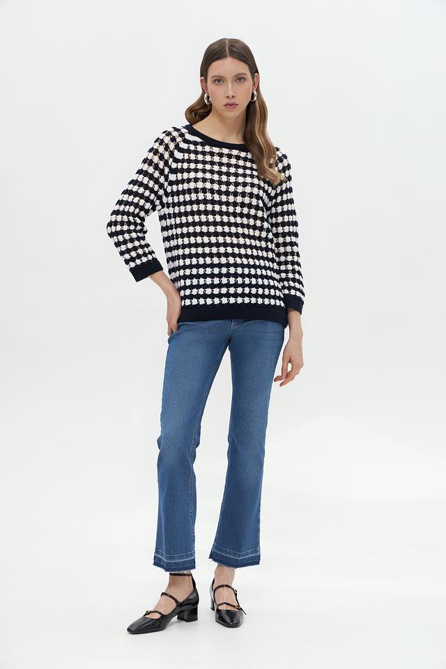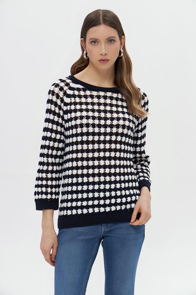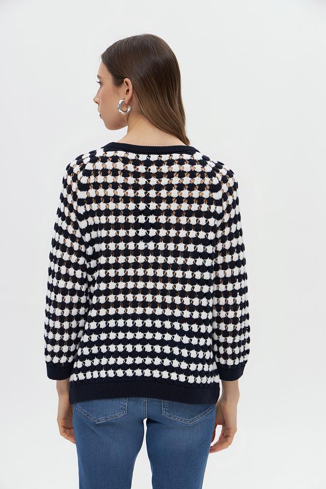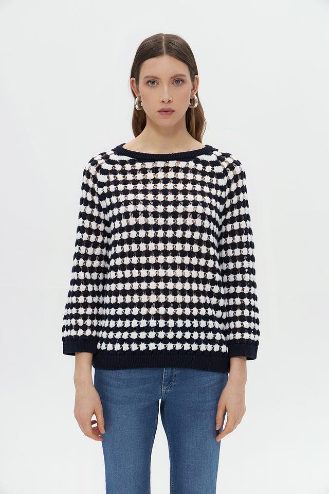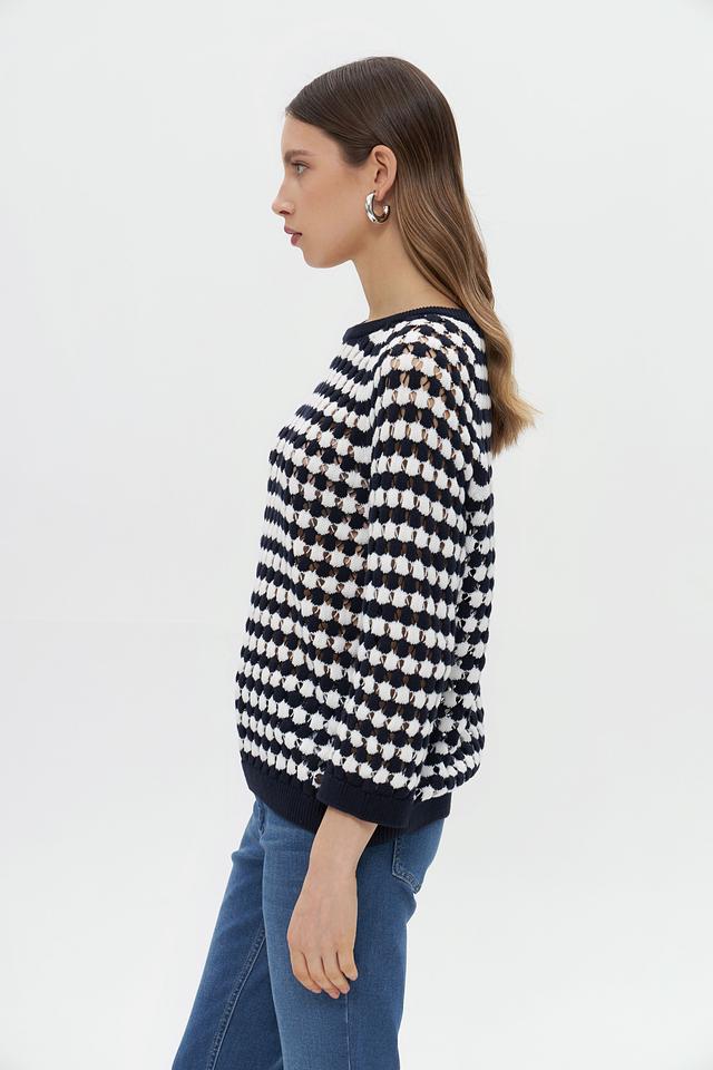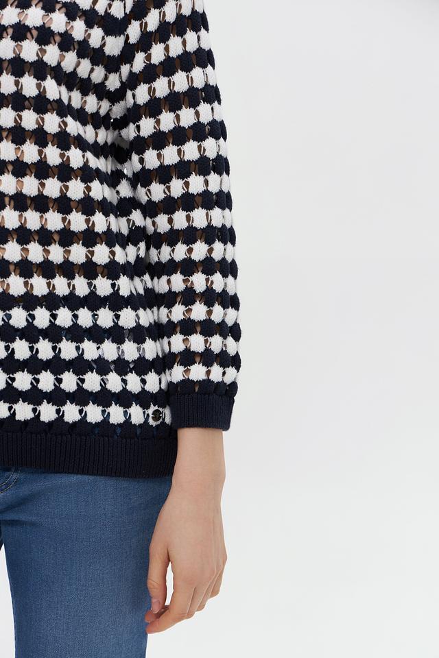 Женский пуловер Monari чёрно-белого цвета с оригинальным узором в полоску. Модель выполнена из мягкого хлопка, обеспечивающего комфорт в носке. Стильный и универсальный выбор для создания повседневных образов. Состав: хлопок 100%