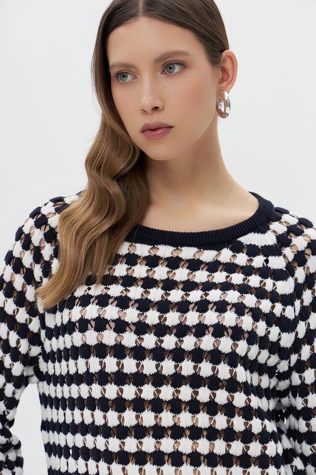 Основной цвет изделия – чёрный, дополненный ярким узором в виде белых полос. Узор создает интересный визуальный эффект и делает этот пуловер особенным.
