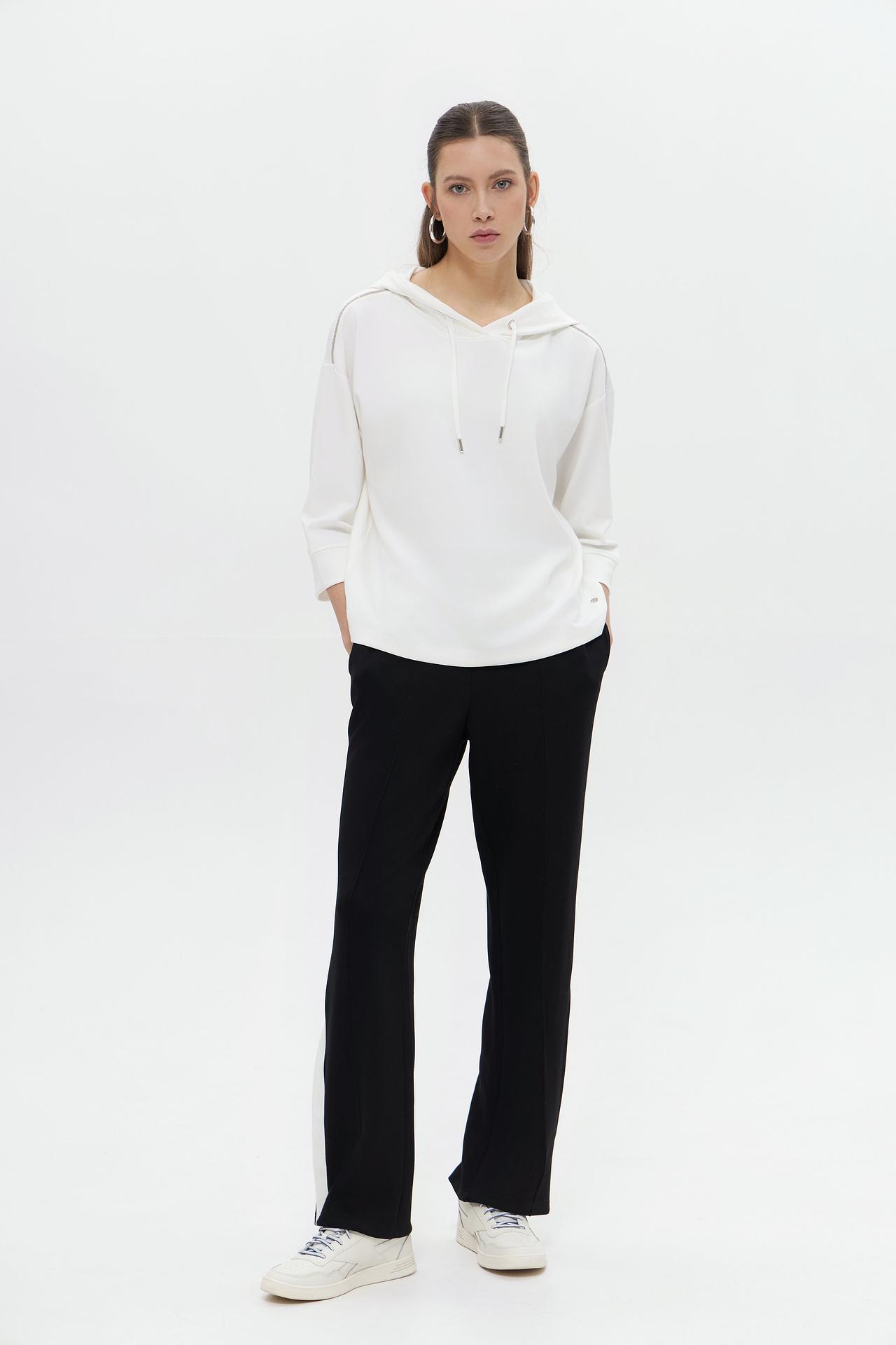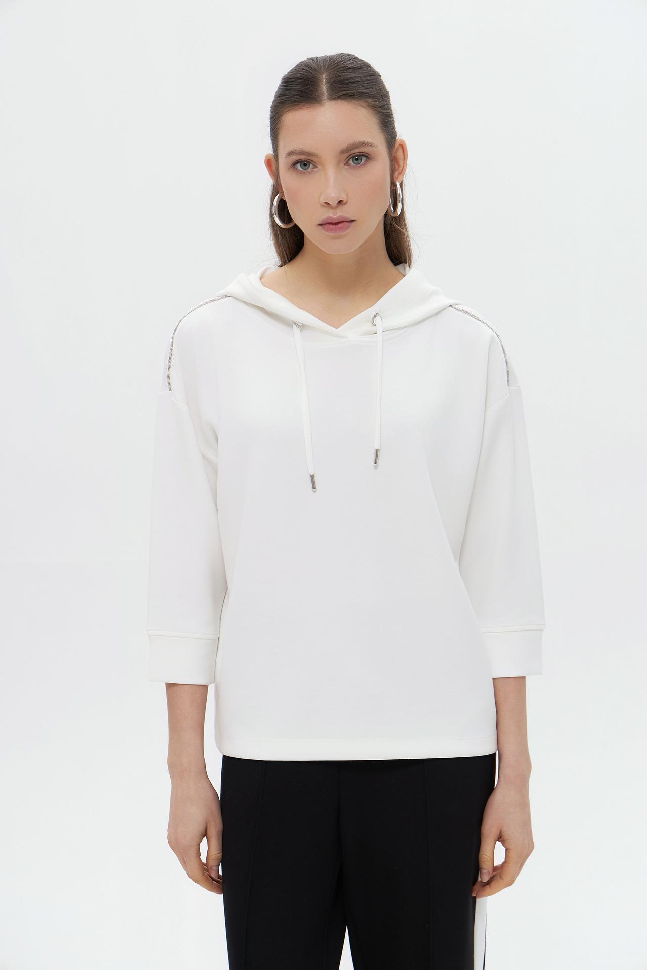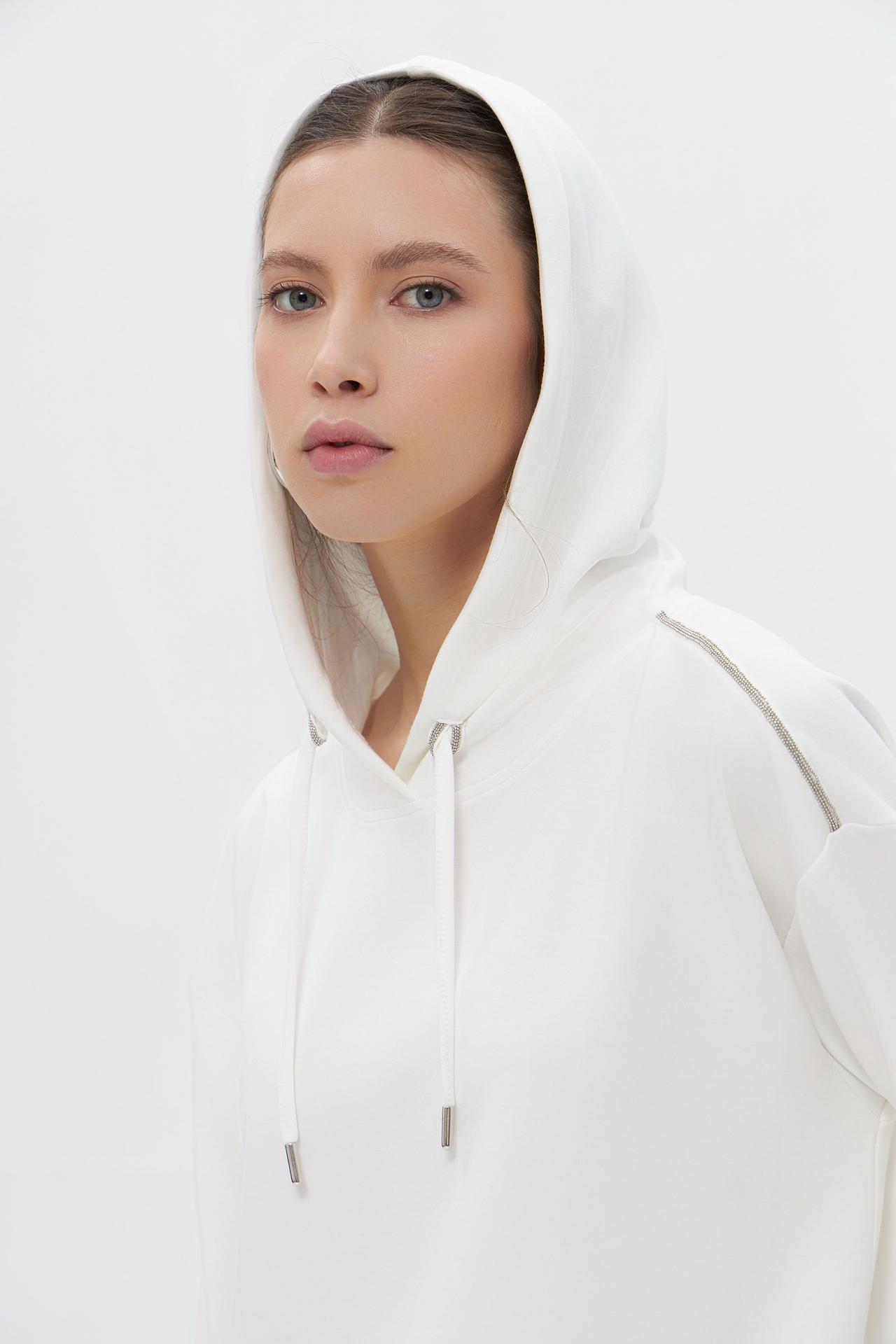 Стильный пуловер Monari с капюшоном и свободным силуэтом – идеальное решение для вашего повседневного гардероба. Изготовлен из уникального сочетания модала, полиэстера и эластана (52% модал, 42% полиэстер, 6% эластан), что обеспечивает исключительный комфорт и долговечность. Модель в чистом белом цвете легко сочетается с любыми элементами гардероба, добавляя образу свежести и элегантности.
