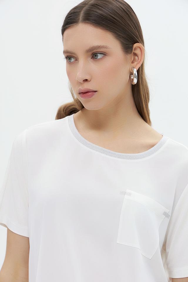 Блуза имеет прямой крой, короткие рукава и круглый вырез горловины. На передней части блузы расположен накладной карман, который добавляет ей функциональности и стиля.