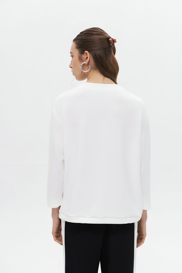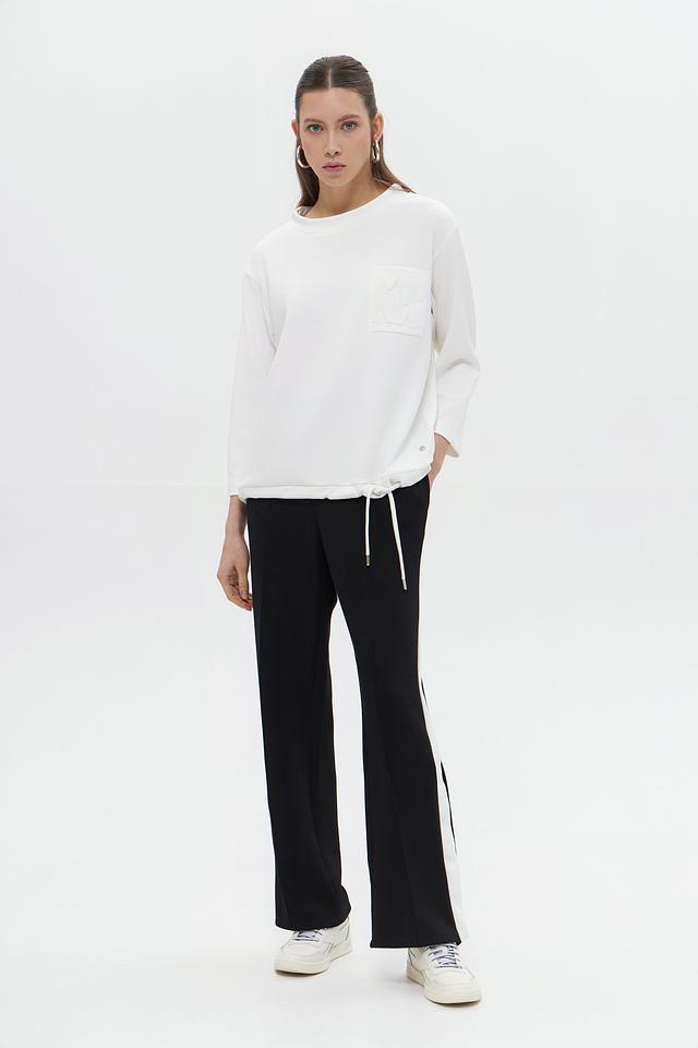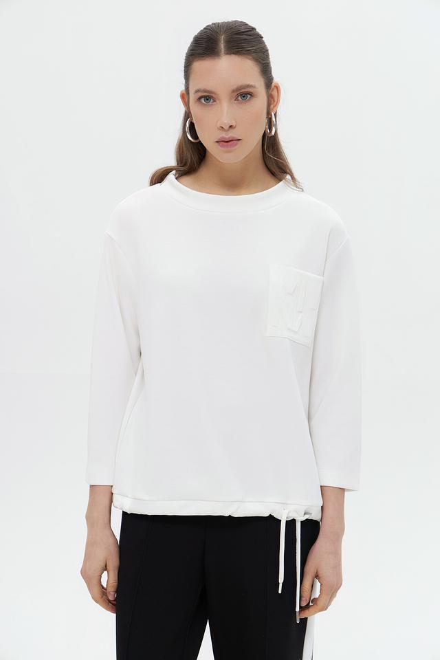 Особенностью модели является кулиска по низу изделия, позволяющая регулировать силуэт и создавать различные образы. Пуловер выполнен в белом цвете, который легко сочетается с другими элементами гардероба. Это отличный выбор для повседневной носки и создания стильных образов.
