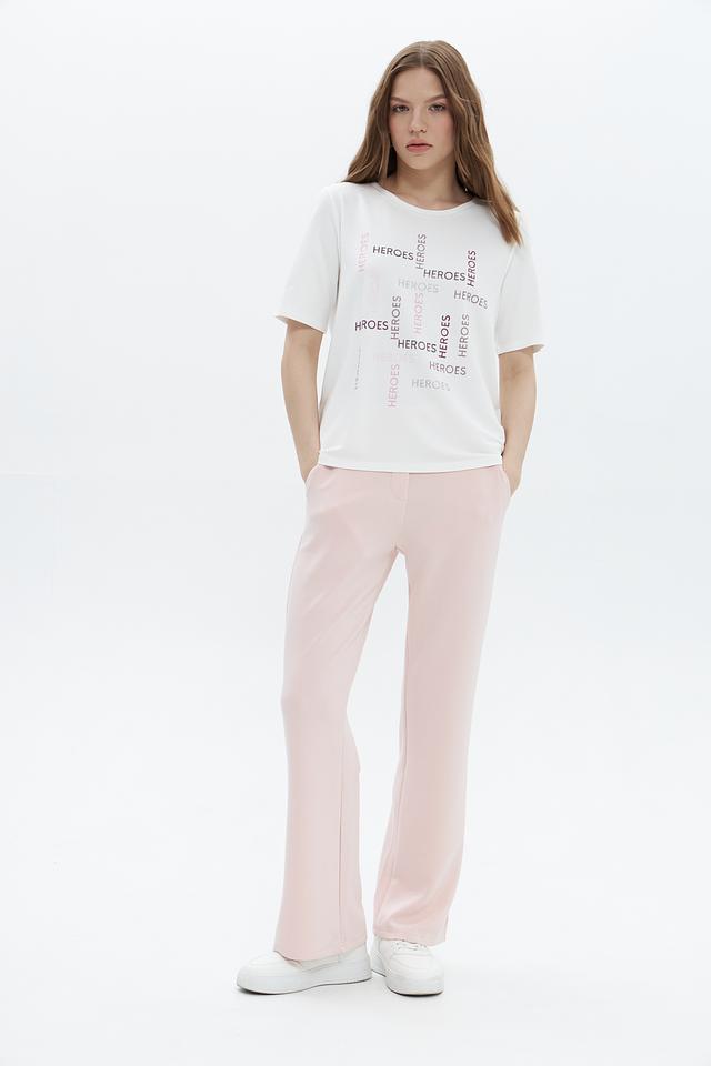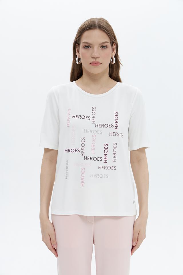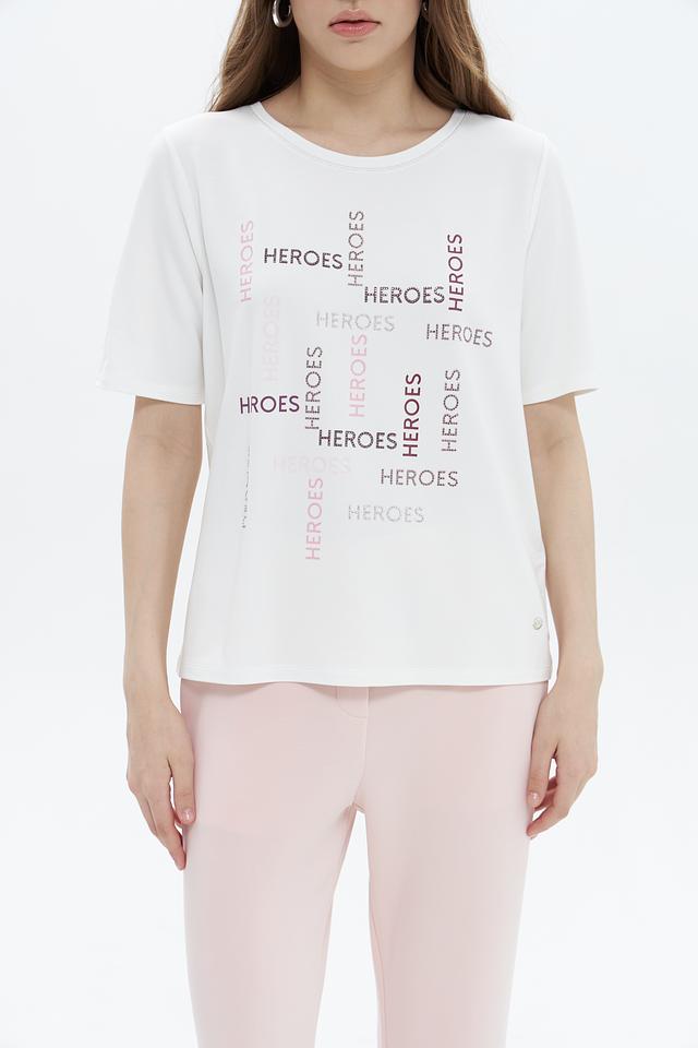 Футболка имеет прямой, слегка свободный крой, который подходит для разных типов фигур. Главной особенностью модели является яркий принт "HEROES", выполненный по всей поверхности изделия. Принт выполнен в белом цвете, что создает эффект легкости и воздушности.