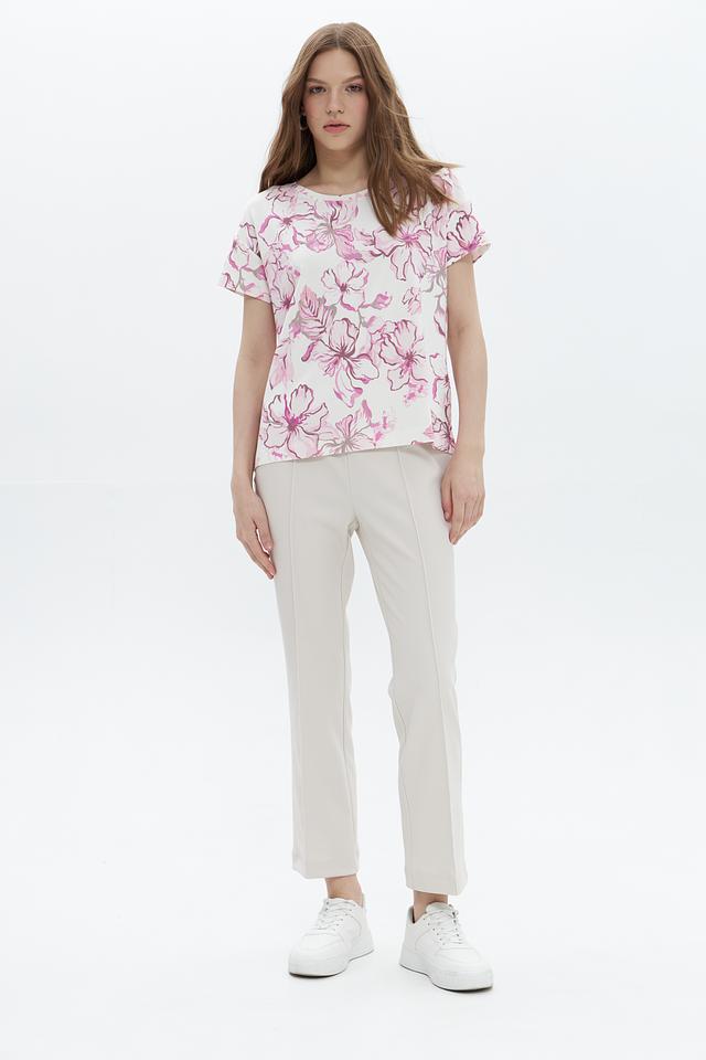 Эта стильная футболка от Monari станет прекрасным дополнением к вашему гардеробу. Футболка выполнена в белом цвете и украшена ярким цветочным принтом, который придает ей женственности и очарования.