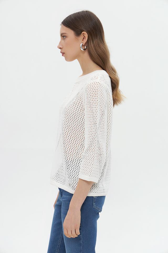 Белый пуловер Monari из 100% хлопка с ажурным узором. Модель имеет короткий рукав и свободный крой, идеально подходит для создания лёгкого и стильного образа. Состав: хлопок 100%