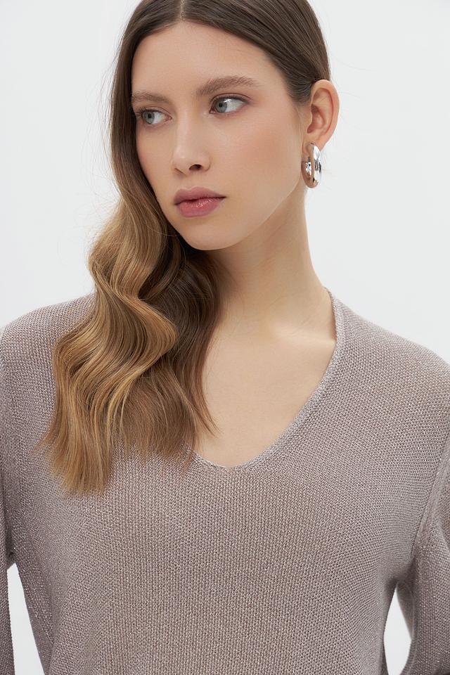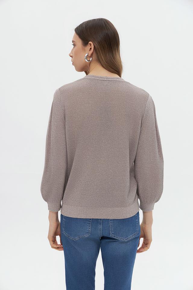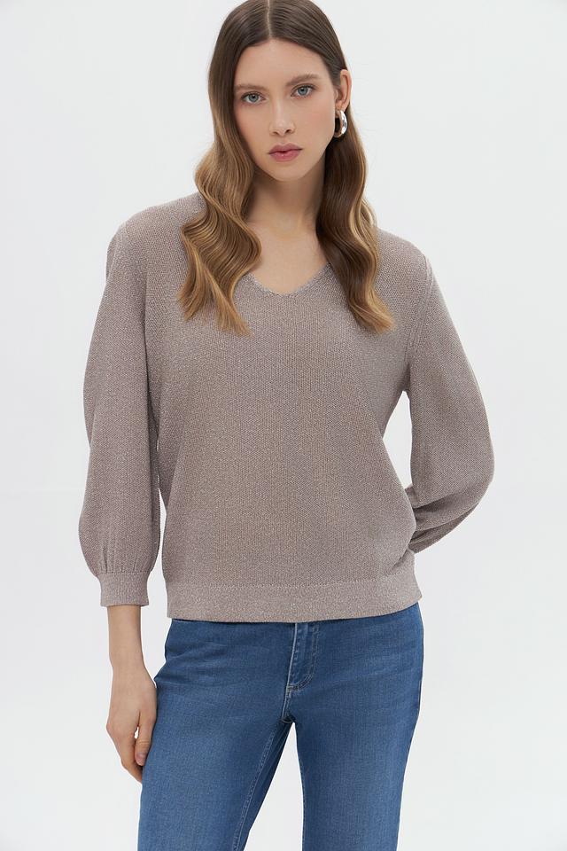 Бежевый пуловер от Monari с рукавом-фонарик и V-образным вырезом. Изготовлен из мягкой вискозы с добавлением полиэстера и полиакрила, что придает ему приятную текстуру и комфорт в носке. Состав: вискоза 48%, полиакрил 24%, полиэстер 21%, метализ.полиэстер 7%