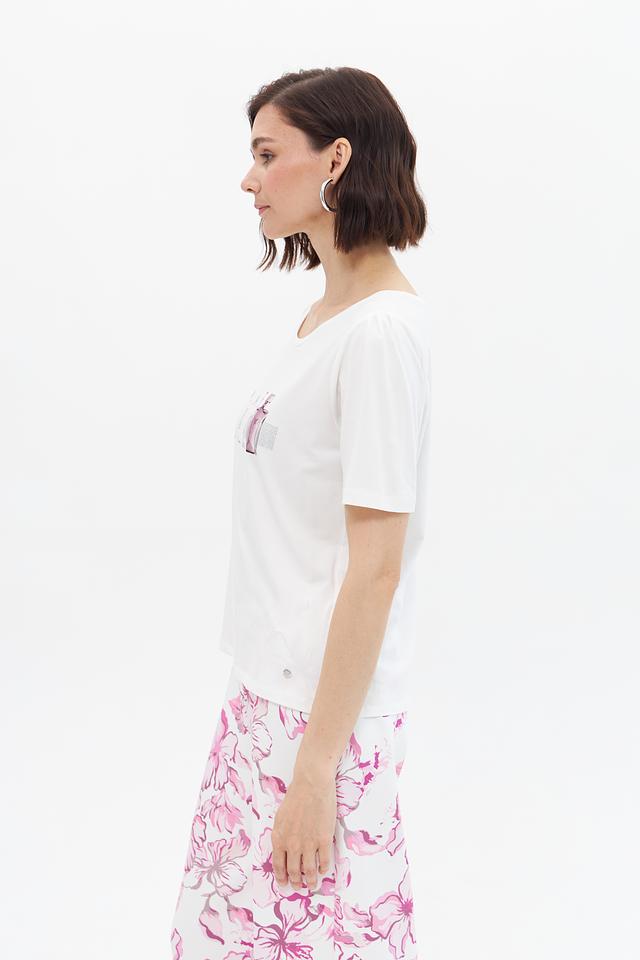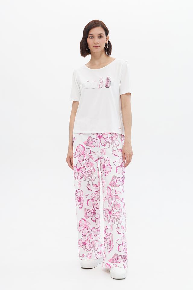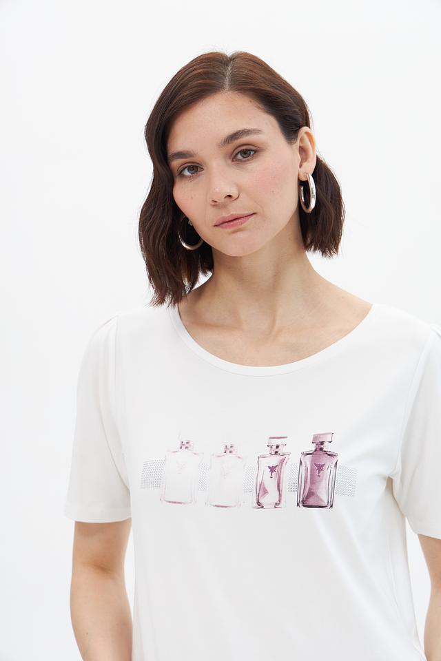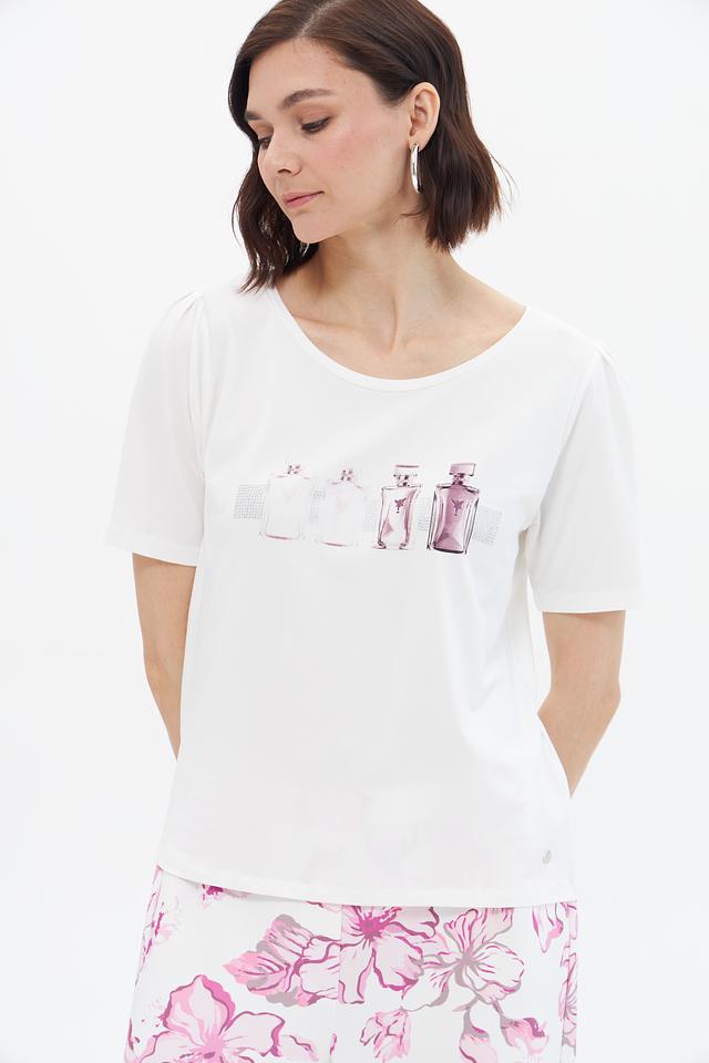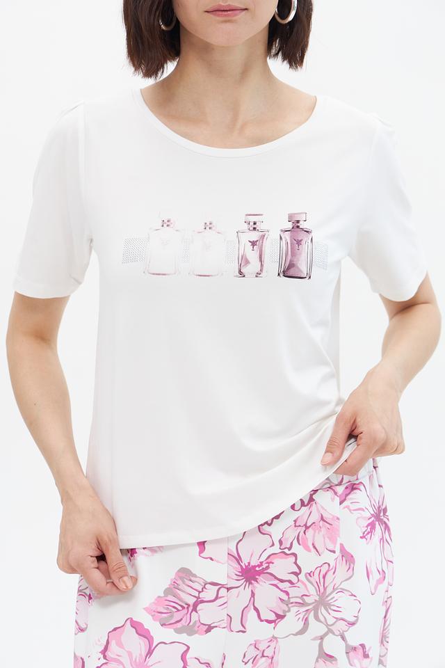 Эта стильная футболка от Monari станет отличным дополнением к вашему гардеробу. Она выполнена в белом цвете и украшена ярким принтом с изображением флаконов духов, что придает ей особый шарм.