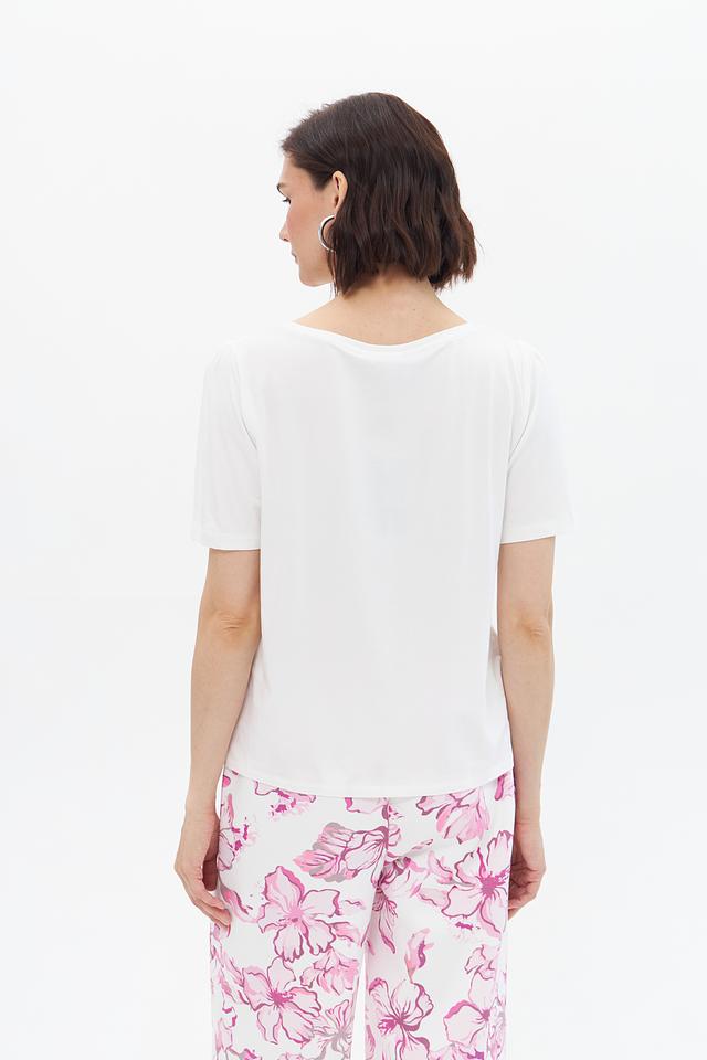 Белая футболка Monari с коротким рукавом и оригинальным принтом в виде флаконов духов. Изготовлена из мягкого и приятного к телу сочетания хлопка и модала, обеспечивающего комфорт в носке. Состав: хлопок 47%, модал 47%, эластан 6%
