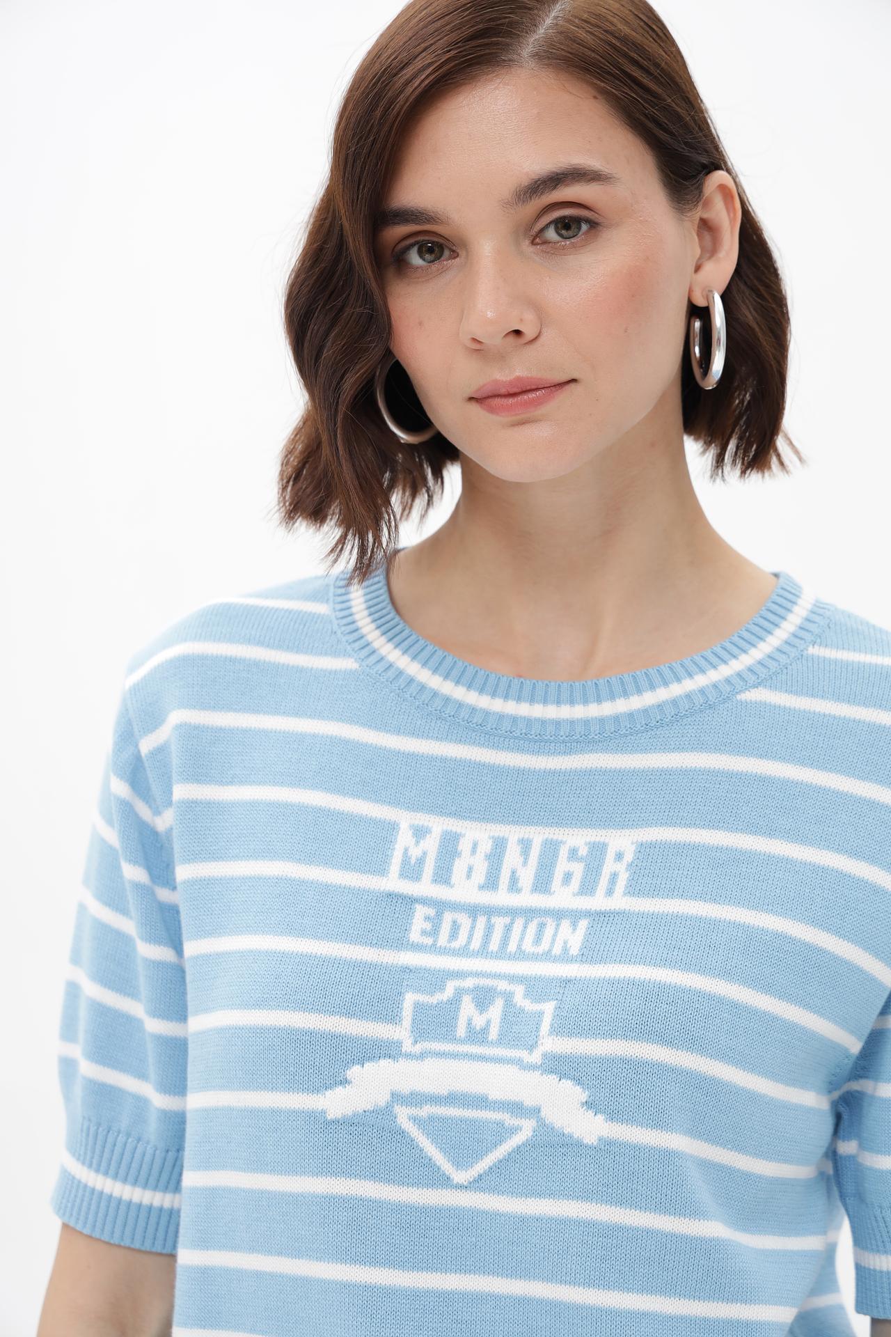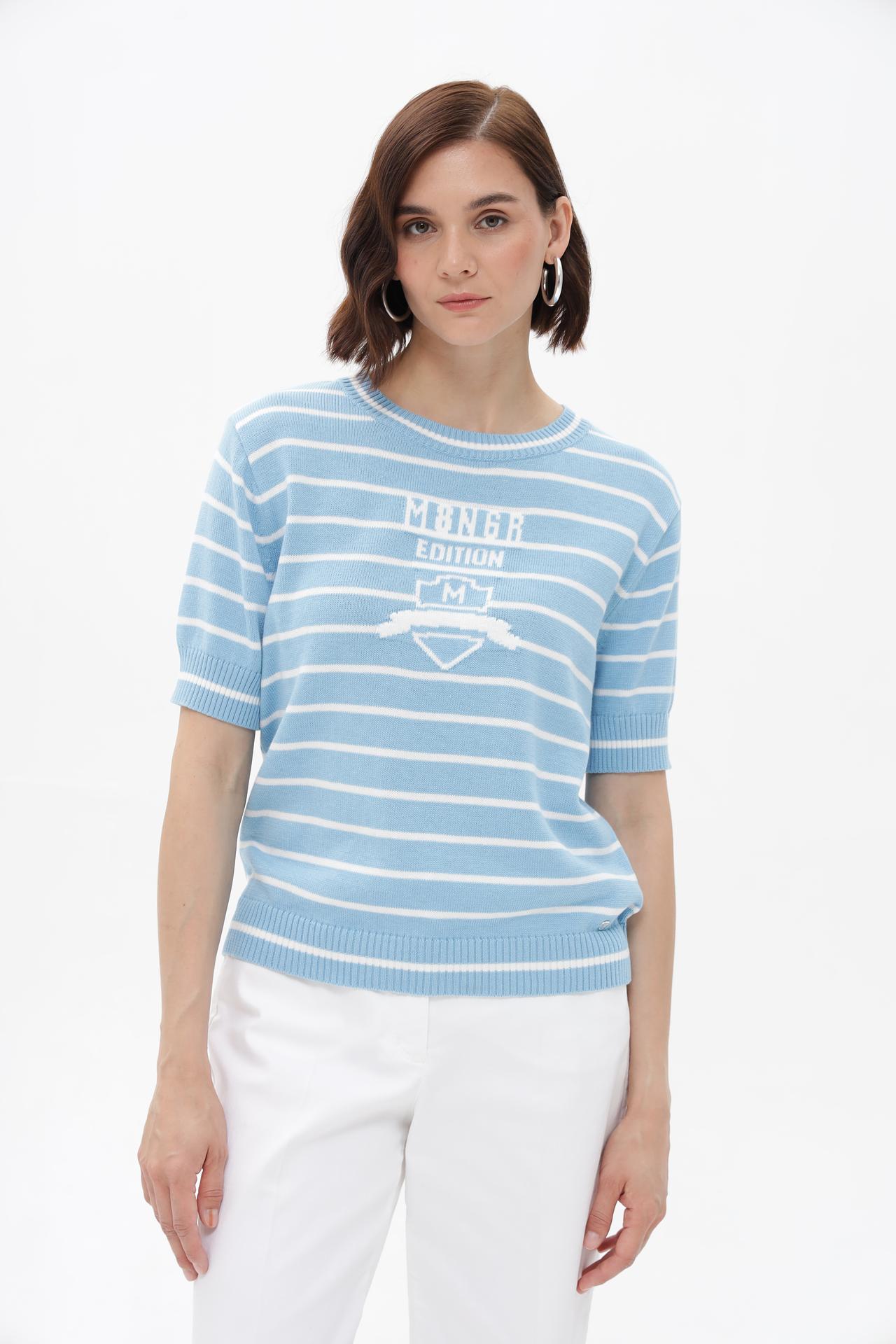 Классический женский пуловер Monari из 100% хлопка — идеальный выбор для создания свежих и стильных образов. Этот хлопковый свитер с коротким рукавом в нежную голубую и белую полоску станет основой вашего летнего гардероба, обеспечивая исключительный комфорт и легкость.