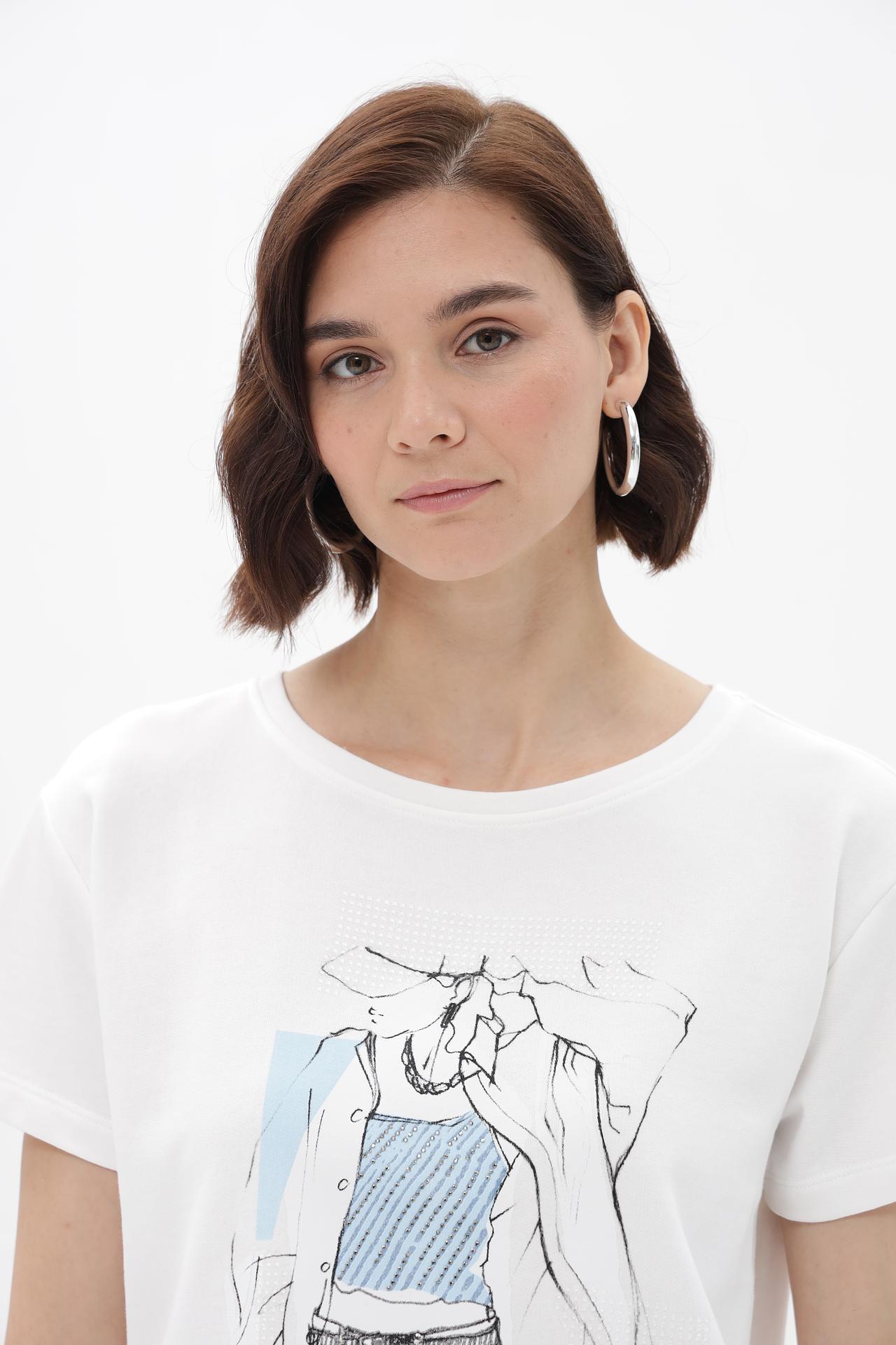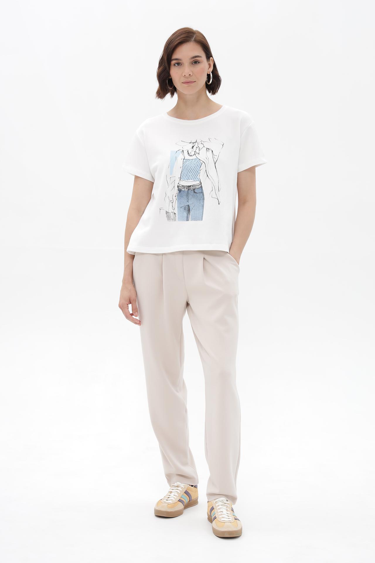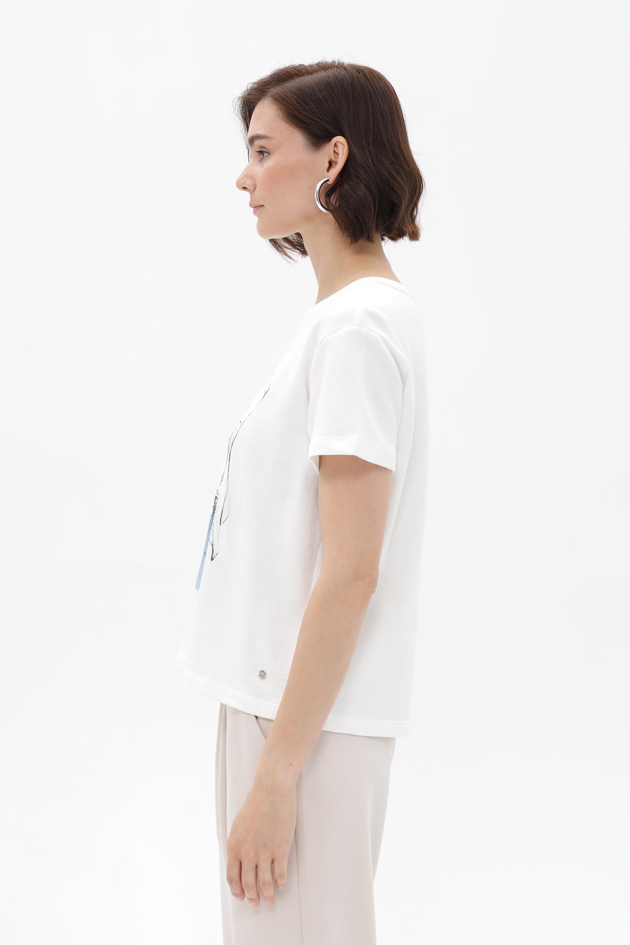 Белая футболка с оригинальным принтом станет ярким акцентом вашего образа. Классический крой и универсальный цвет делают ее подходящей для сочетания с различными элементами гардероба: от джинсов до юбок.
