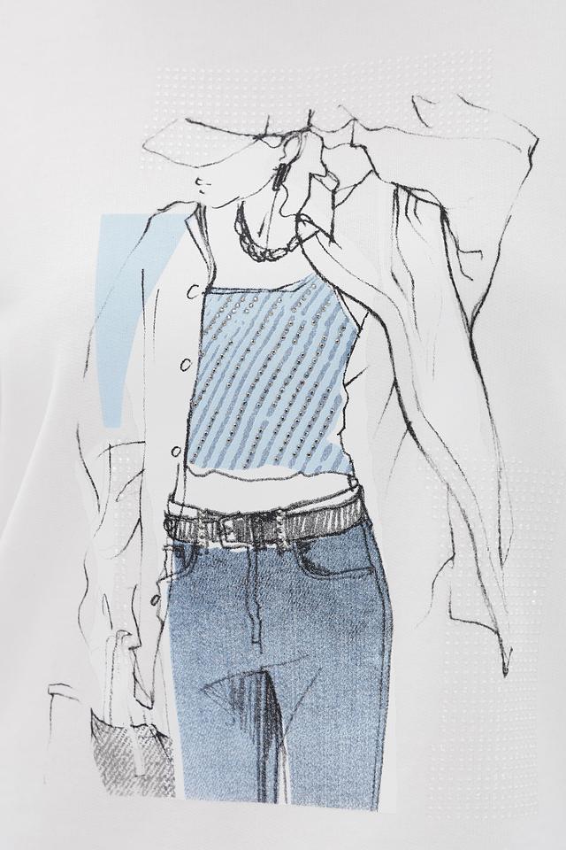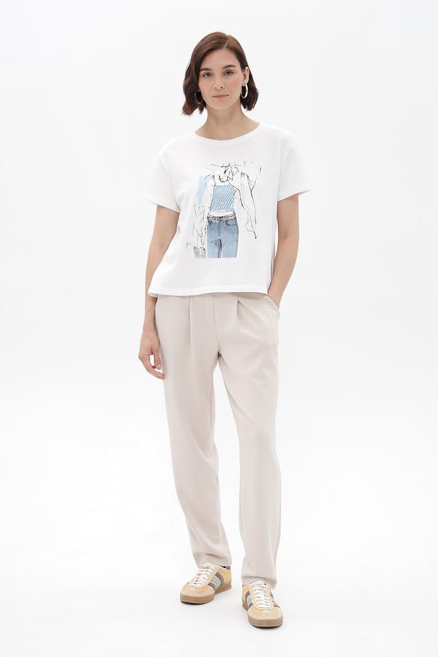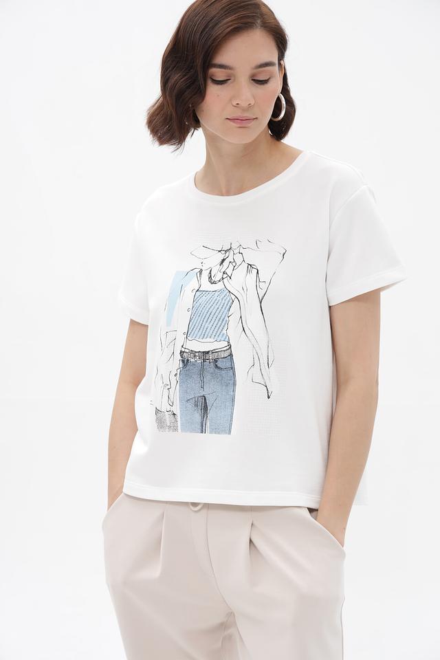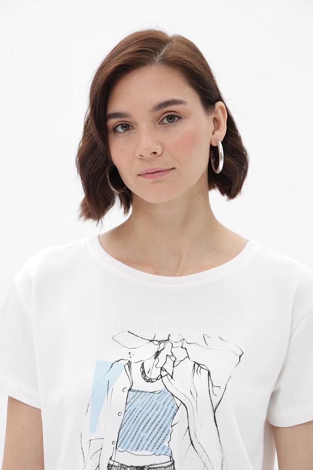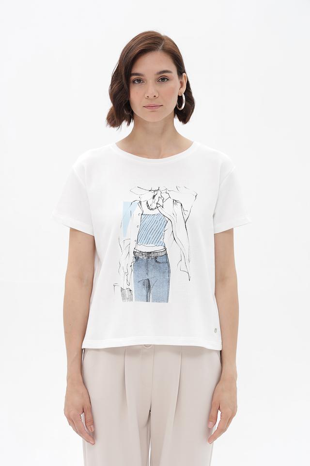 Белая футболка Monari с оригинальным принтом в виде графичного рисунка. Изготовлена из 100% хлопка, обеспечивающего комфорт и воздухопроницаемость. Стильный и универсальный вариант для повседневного образа. Состав: хлопок 100%