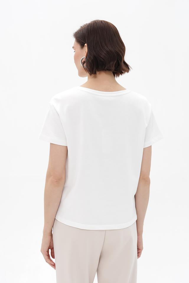 Футболка имеет классический прямой крой, короткие рукава и круглый вырез горловины. Она идеально подходит для создания повседневных образов, сочетаясь с джинсами, брюками или юбками. Благодаря своему лаконичному дизайну и качественному материалу, эта футболка станет незаменимой вещью в вашем гардеробе.