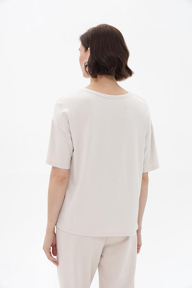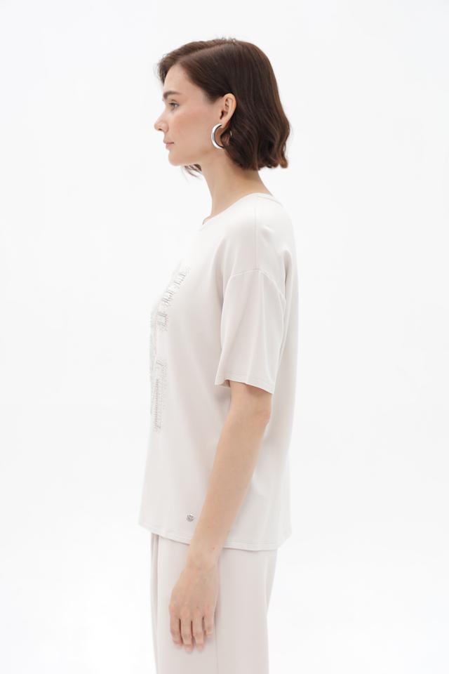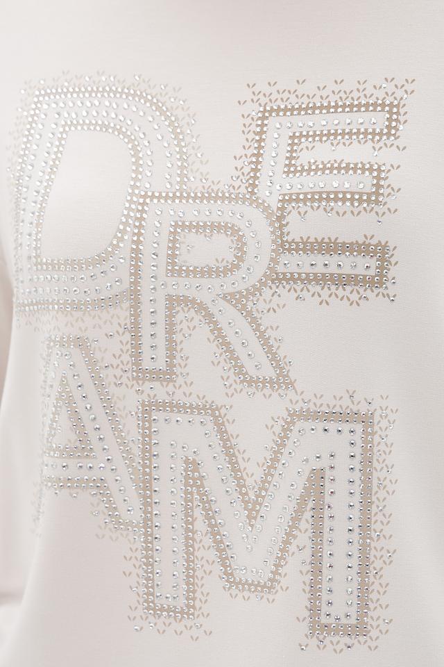 Представляем стильную и комфортную футболку от бренда Monari. Модель выполнена в нежном бежевом цвете и украшена эффектной надписью “DREAM”, выложенной серебристыми стразами.