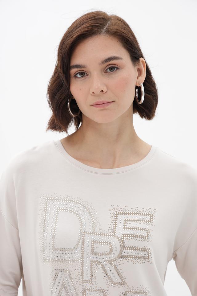 Бежевая футболка Monari с декоративной надписью “DREAM”, выполненная из мягкого трикотажа. Состав включает вискозу, модал и эластан для комфорта и хорошей посадки. Состав: вискоза 45%, модал 45%, эластан 10%