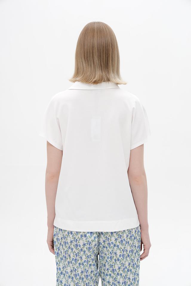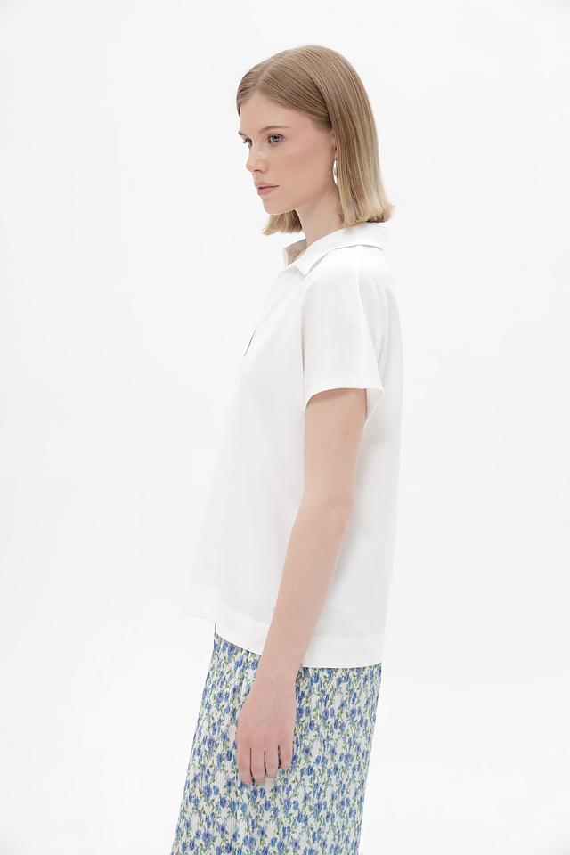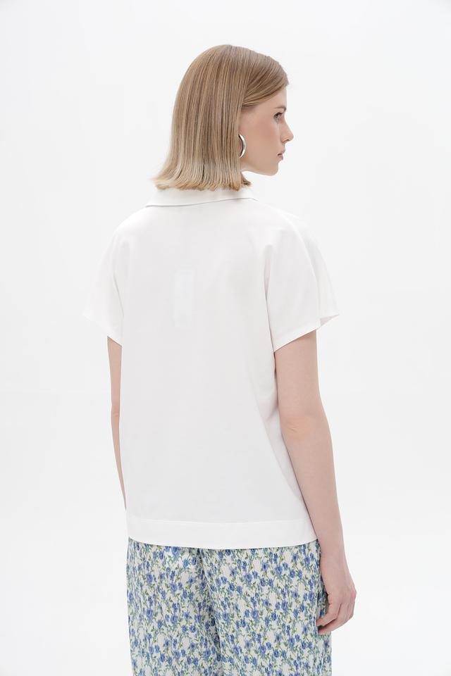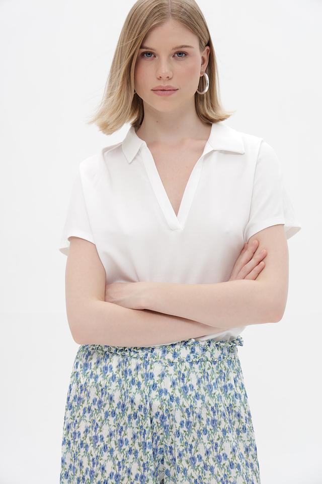 Модель имеет классический крой с короткими рукавами и V-образным вырезом, обрамленным воротником-поло. Прямой силуэт не сковывает движений, а лаконичный дизайн позволяет сочетать эту футболку с различными элементами одежды – от джинсов и брюк до юбок и шорт.