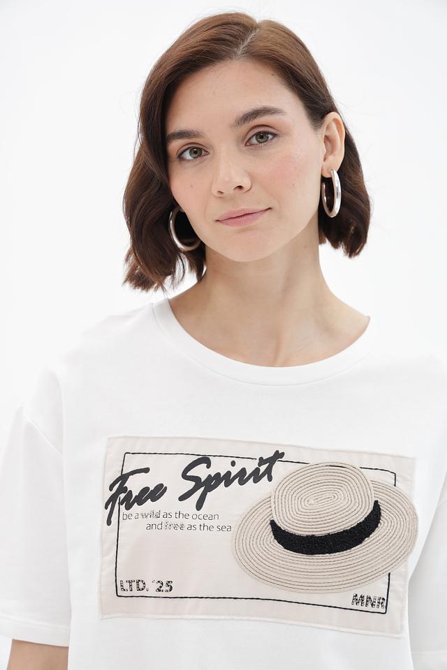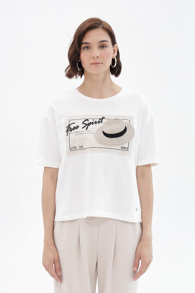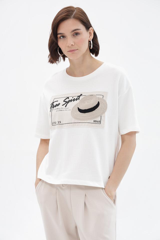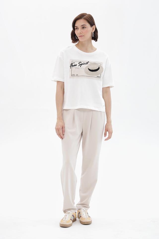 Белая футболка Monari с оригинальным принтом "Free Spirit" станет стильным дополнением к вашему гардеробу. Модель из 100% хлопка обеспечивает комфорт и удобство в носке. Состав: хлопок 100%