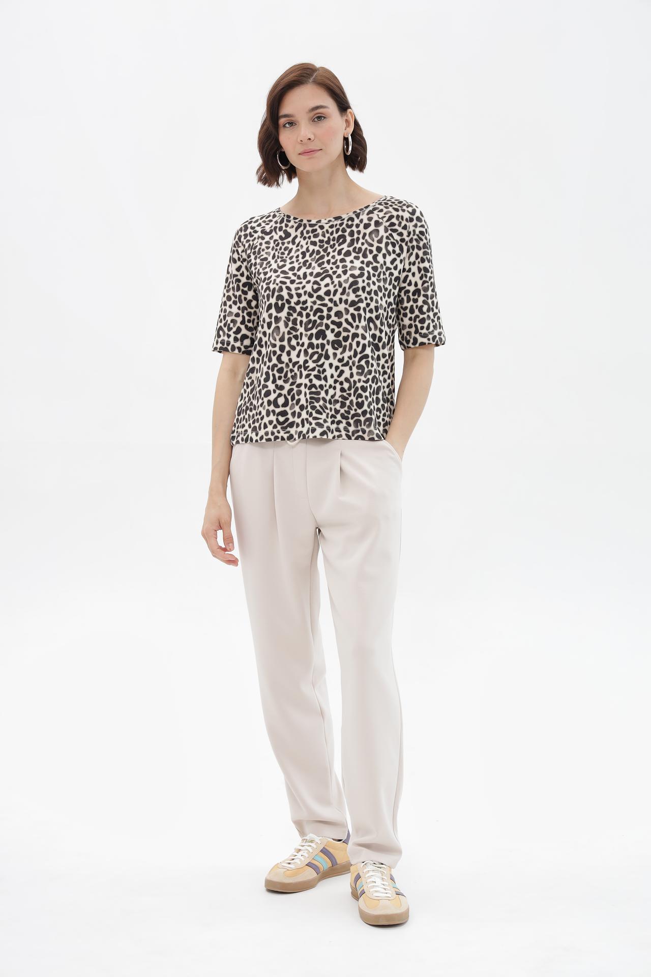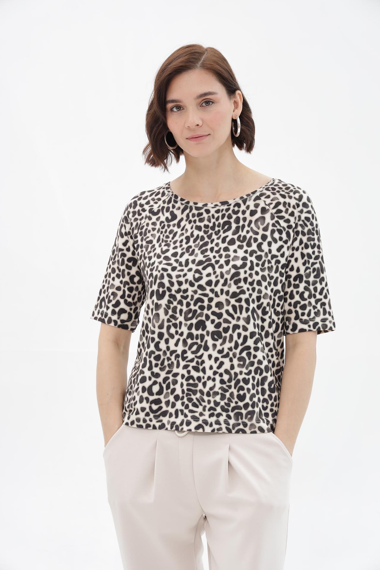 - Универсальность: Леопардовая футболка прекрасно сочетается с джинсами, брюками и юбками, позволяя создавать разнообразные образы.