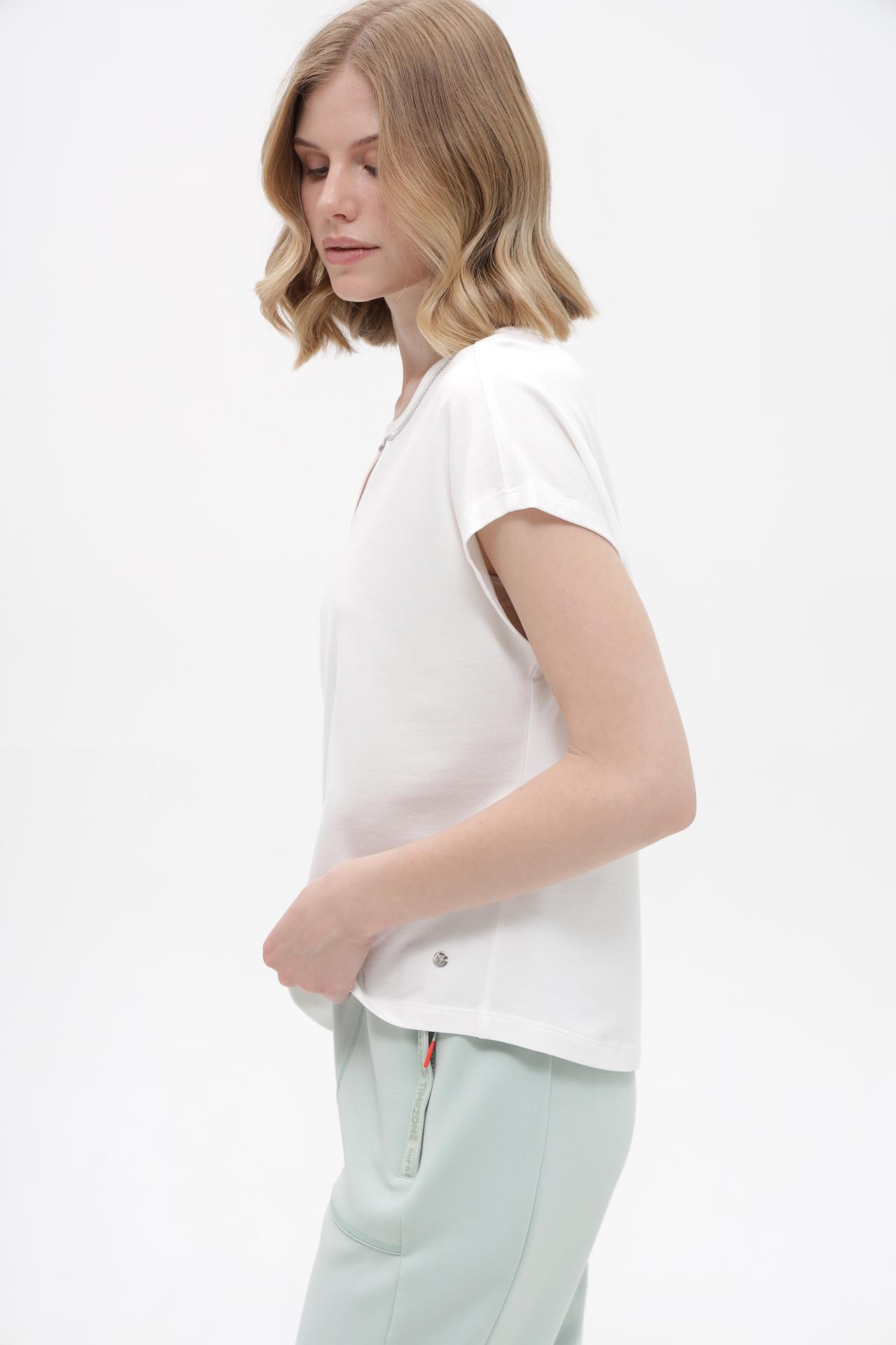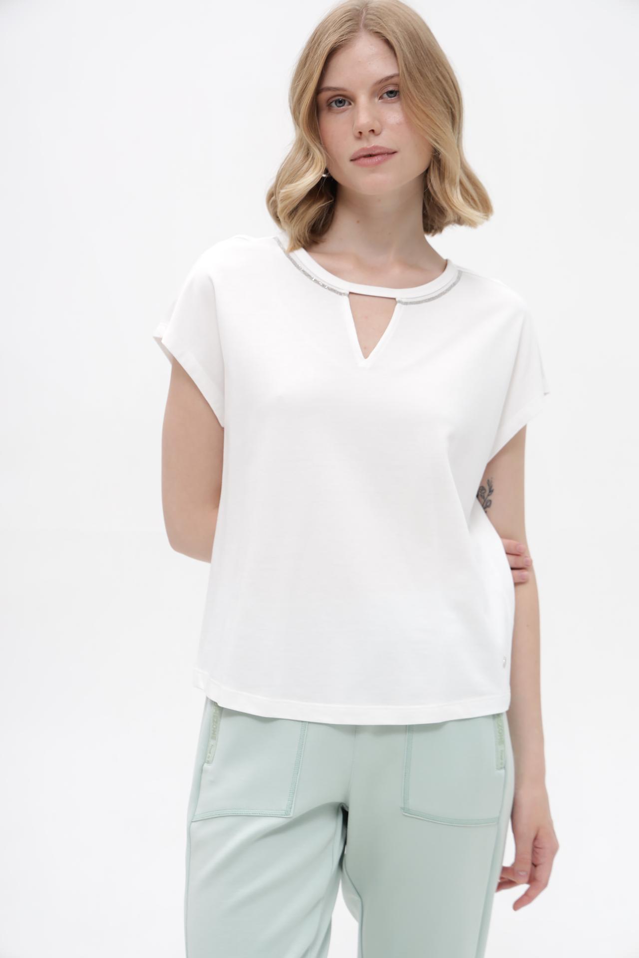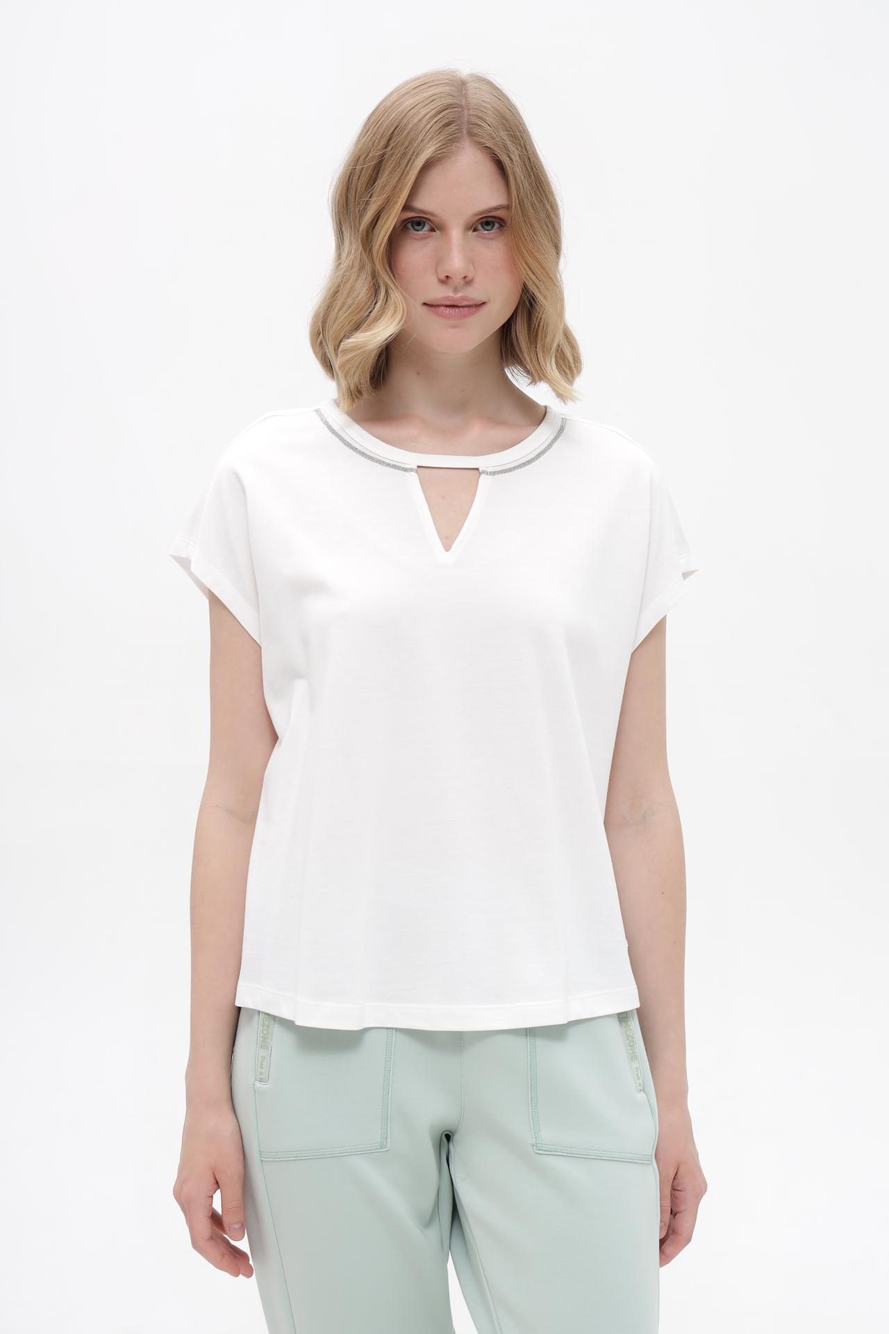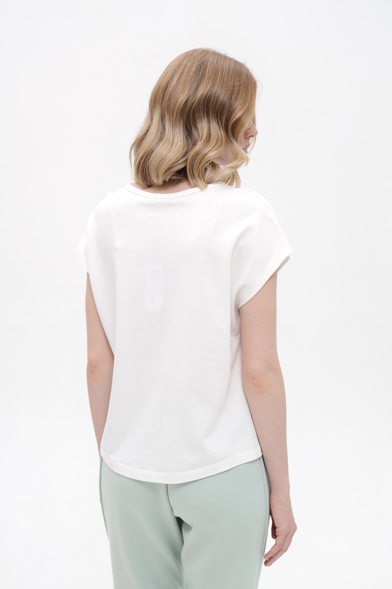 Белая футболка - это классика, которая легко сочетается с любым гардеробом. Она станет универсальным решением для создания множества образов, от повседневных до более формальных. Модель украшена нежным декором, который добавляет изюминку в общий вид.