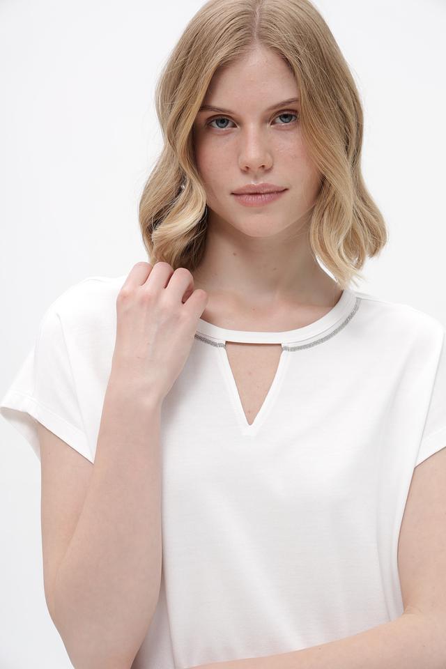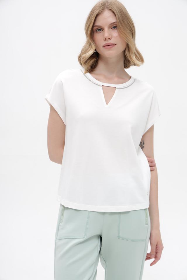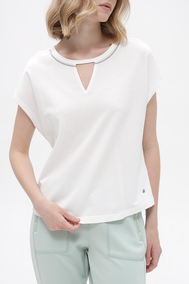 Белая футболка Monari из хлопка и модала с оригинальным вырезом на горловине. Легкий и приятный к телу материал обеспечивает комфорт в течение дня. Состав: хлопок 50%, модал 50%