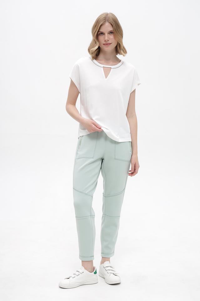 Модель имеет прямой крой и короткие рукава с аккуратными манжетами. Особый акцент сделан на вырезе горловины – небольшой V-образный вырез, обрамленный деликатной отделкой, придает футболке изысканность и женственность.