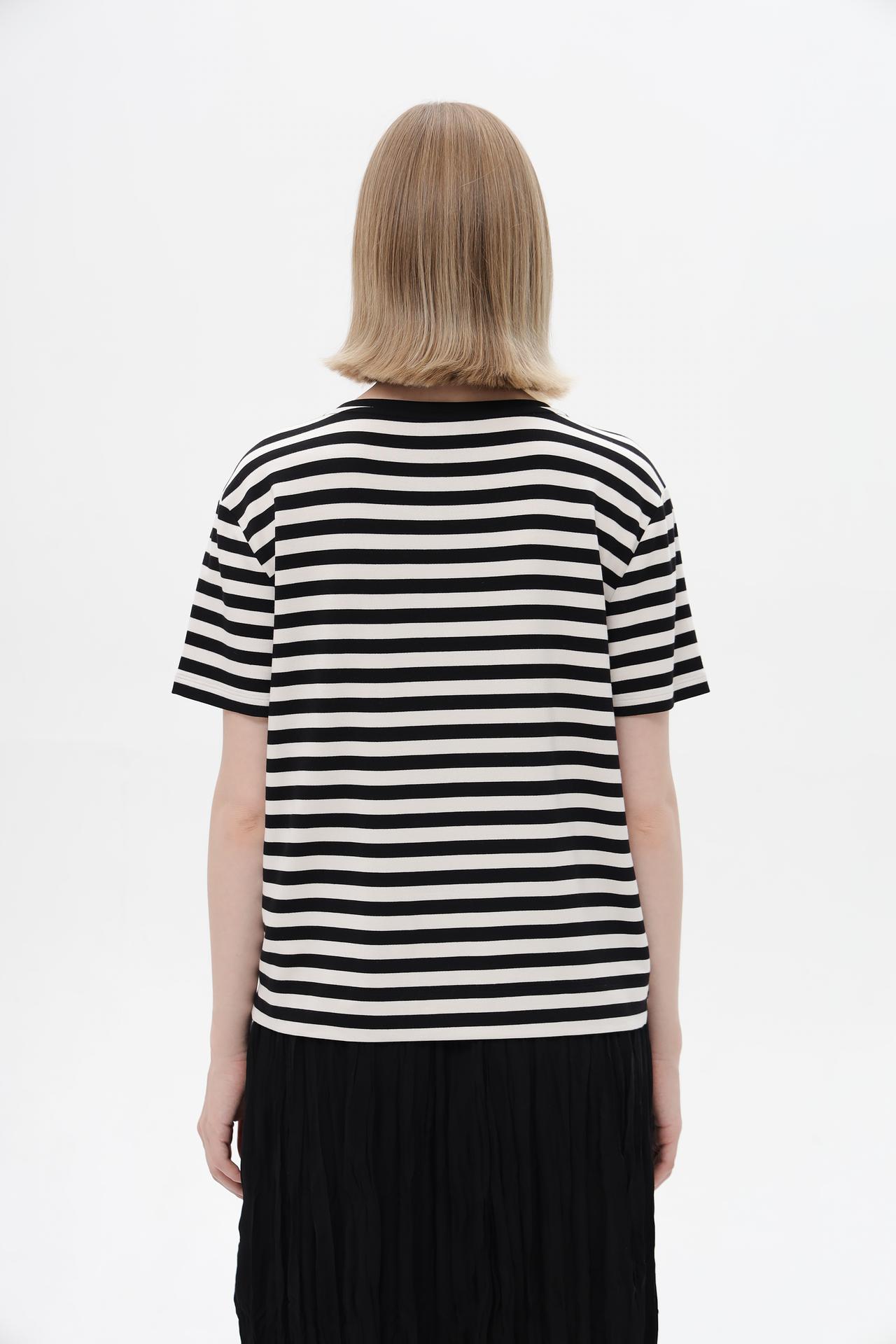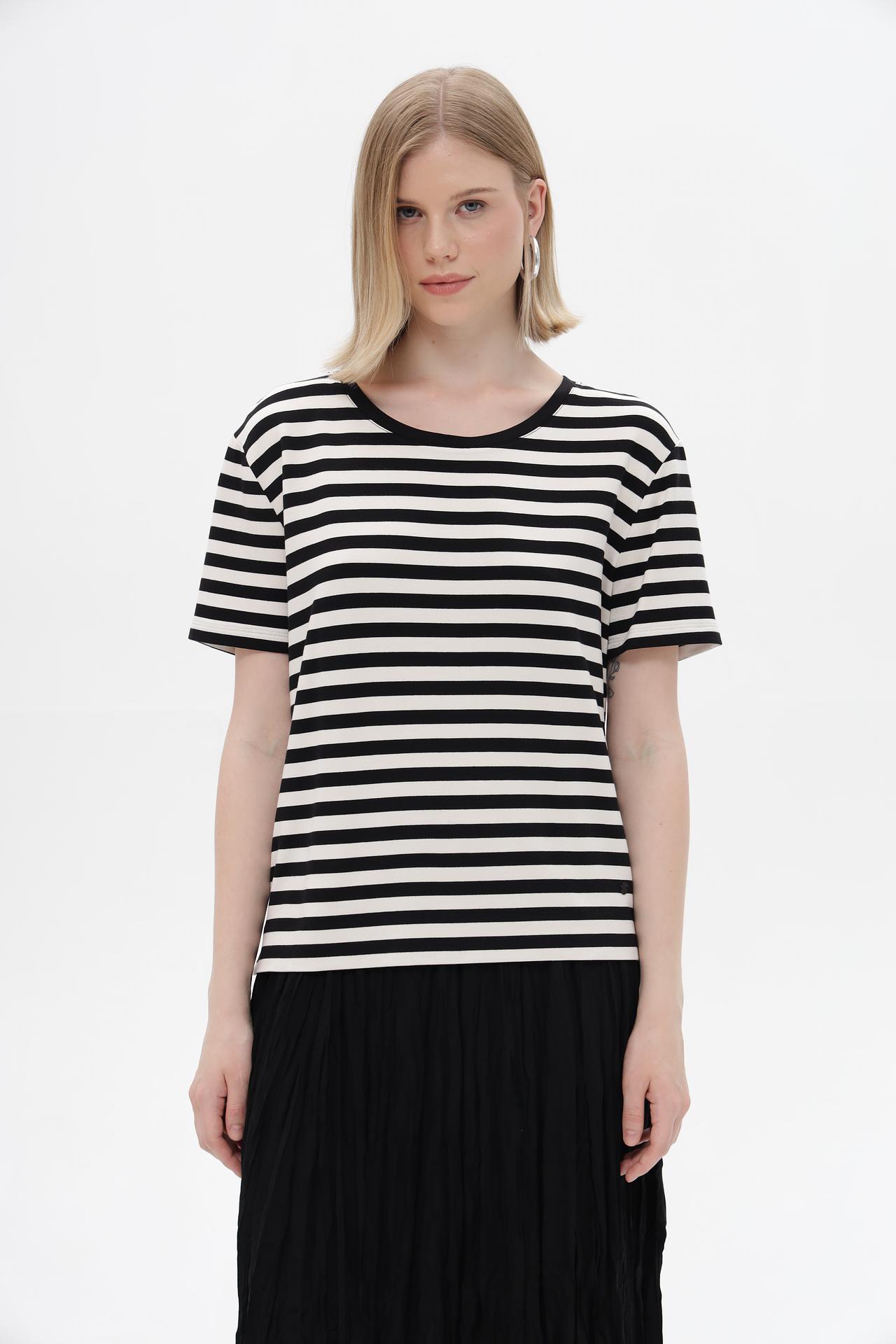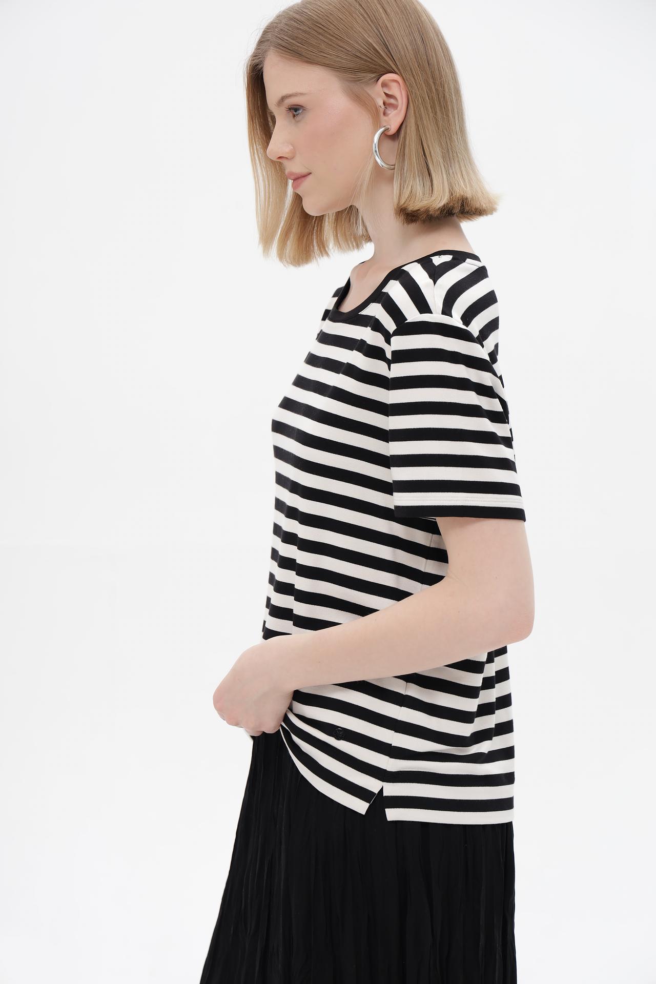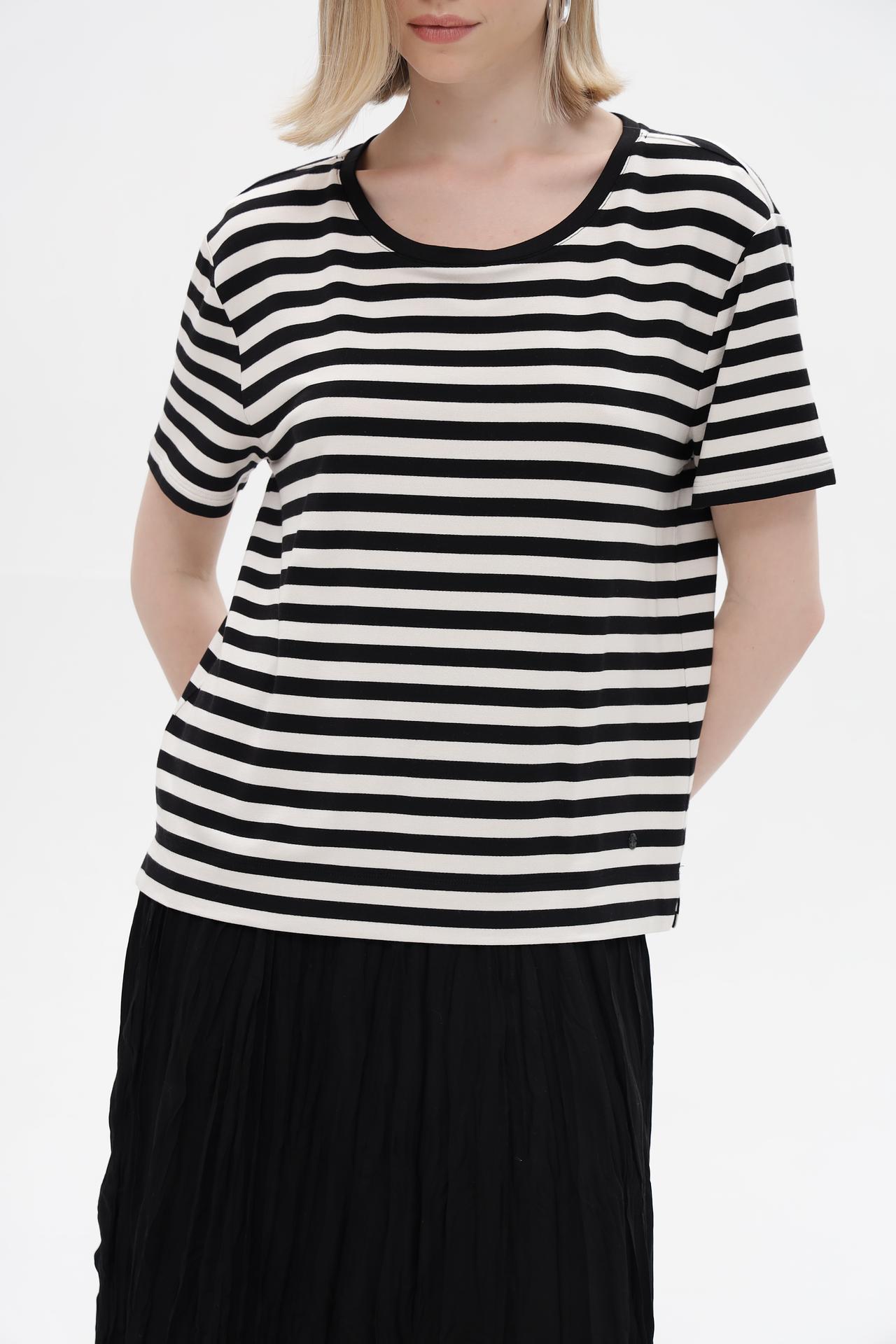 - Классический дизайнЧёрно-белая горизонтальная полоска – это вечный тренд, который всегда остаётся актуальным. Круглый вырез и короткие рукава делают эту женскую футболку Monari базовой вещью, легко комбинируемой с брюками, юбками или джинсами.