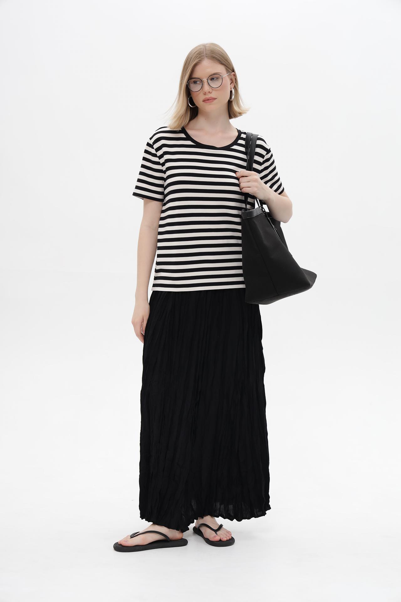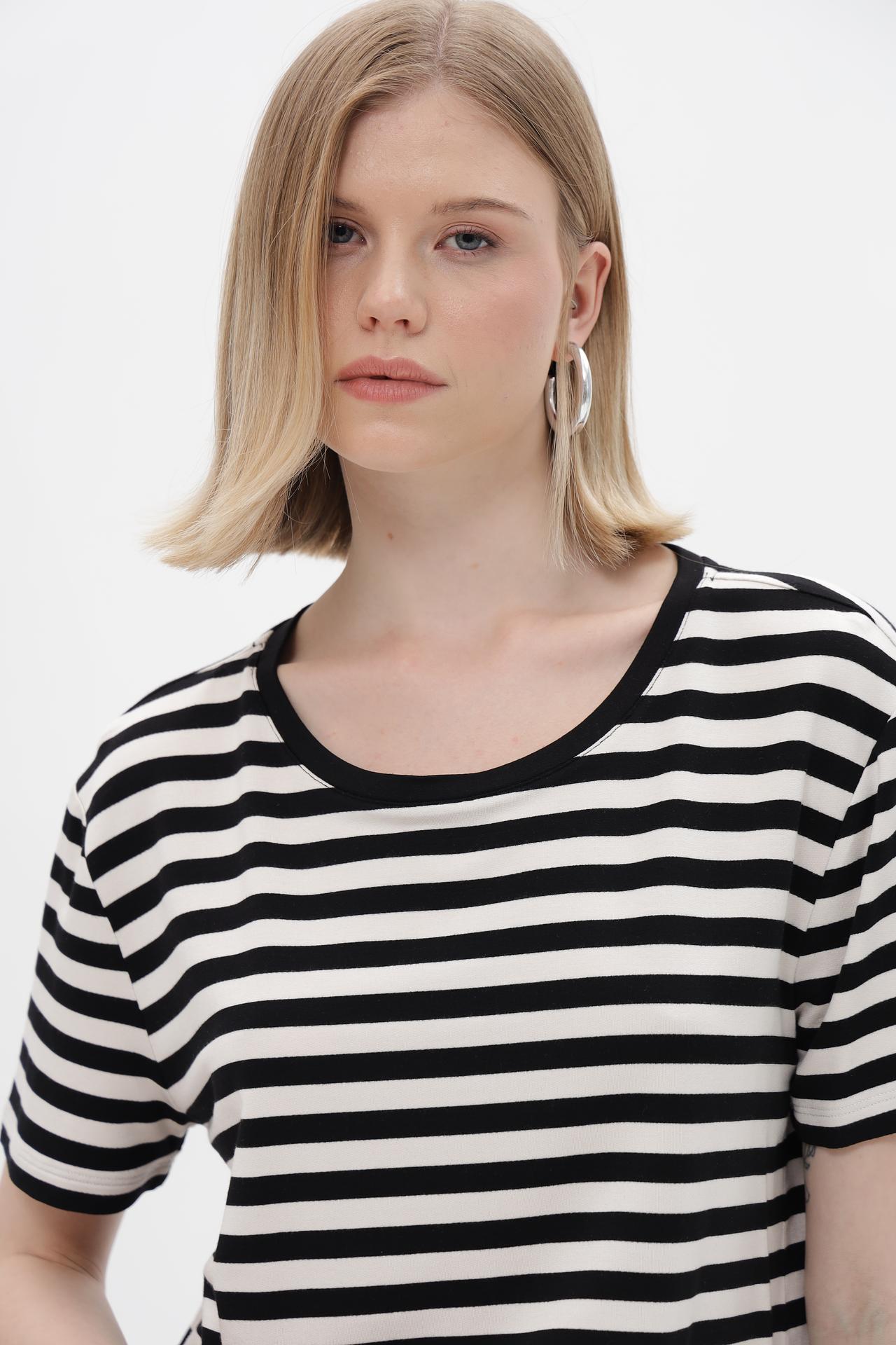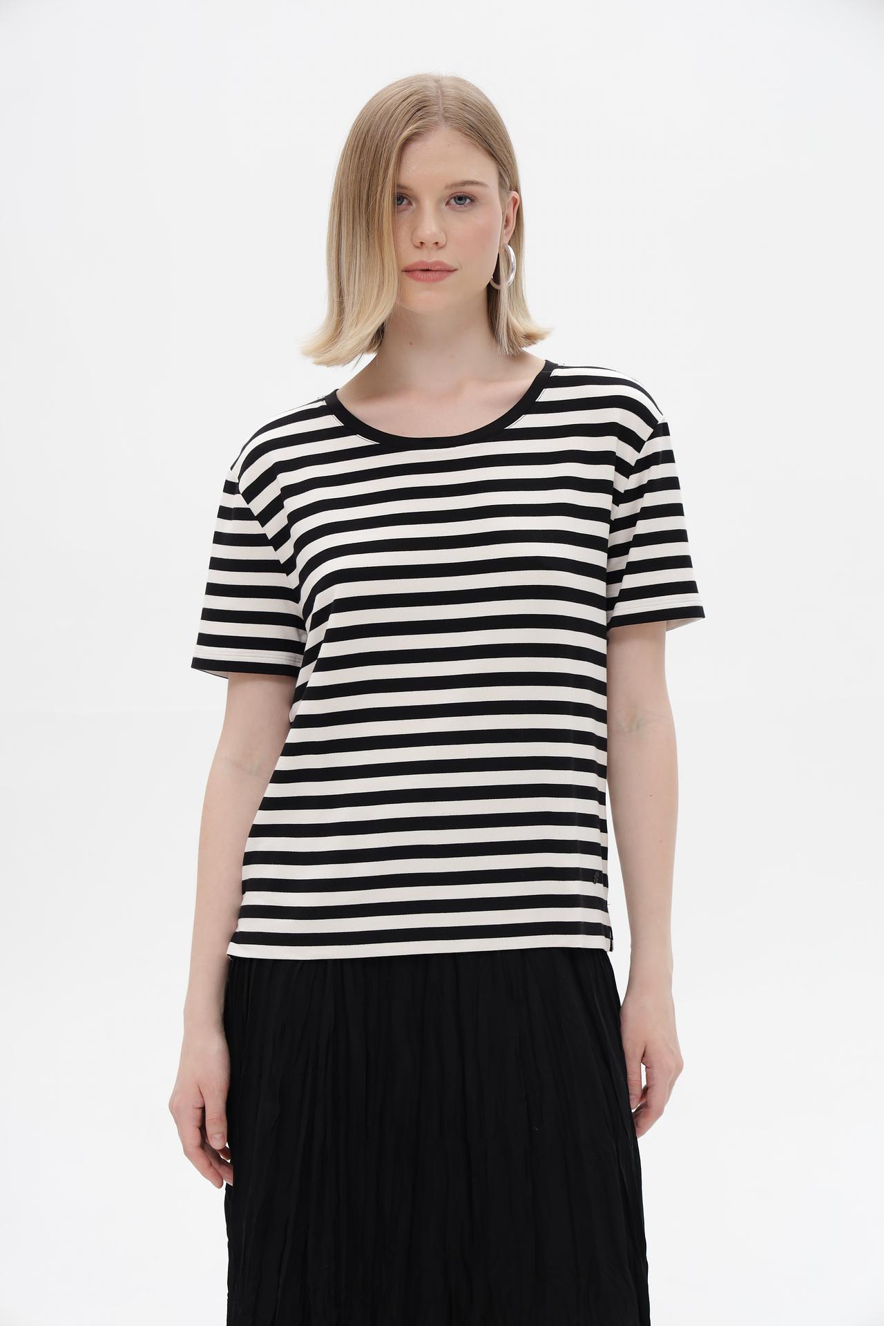Женская футболка Monari – идеальный выбор для создания стильного и комфортного образа. Модель выполнена из высококачественного полотна, сочетающего 45% вискозы, 10% эластана и 45% модала, что обеспечивает исключительную мягкость и долговечность. Классический чёрно-белый полосатый принт делает её универсальным элементом гардероба, подходящим как для повседневных, так и для более элегантных комплектов.