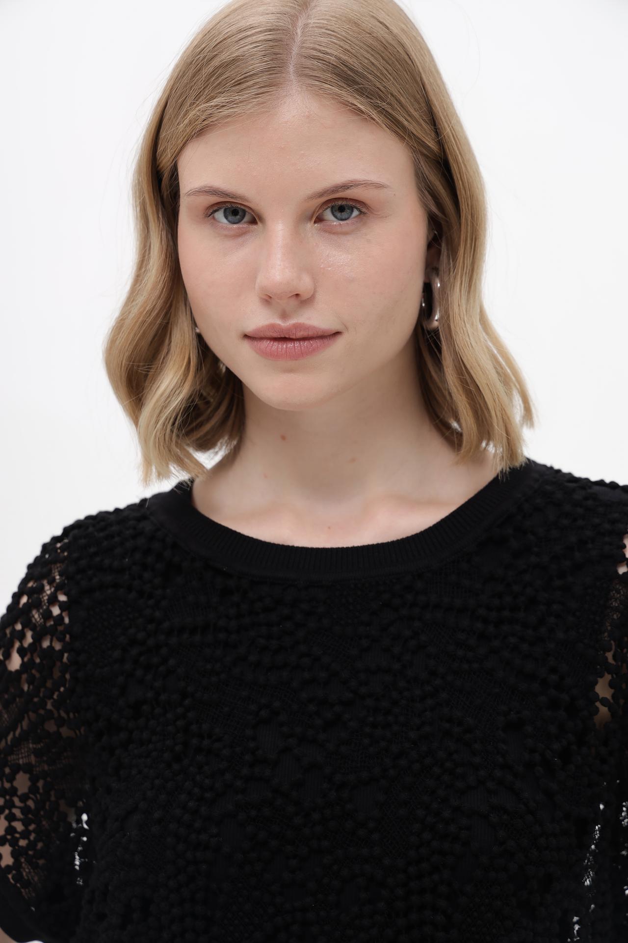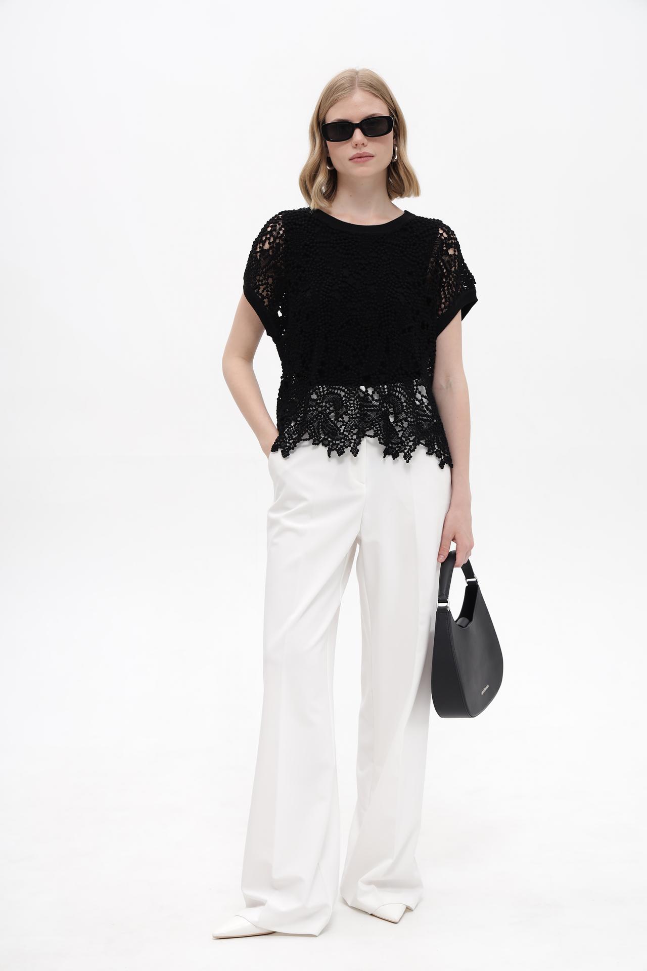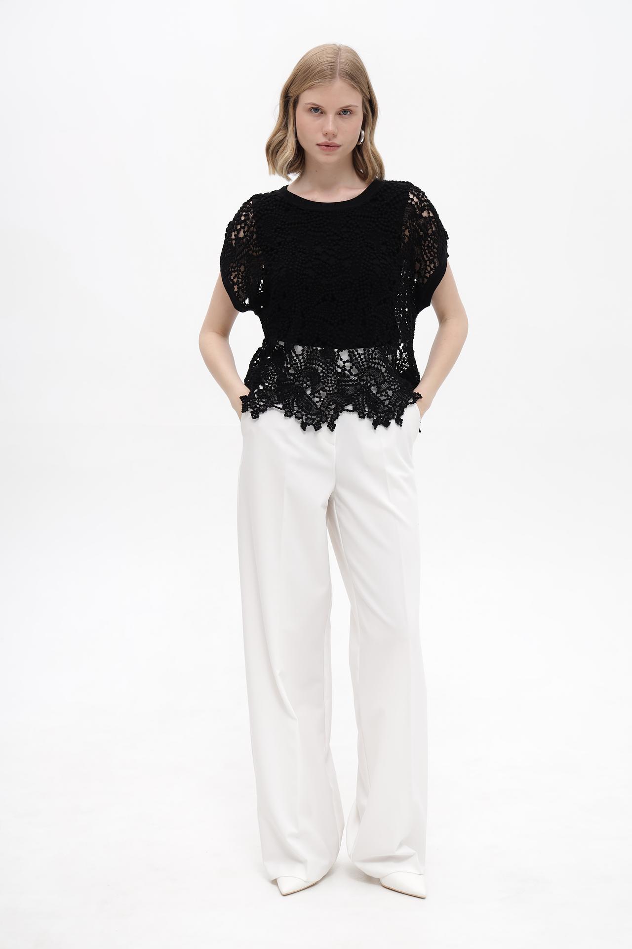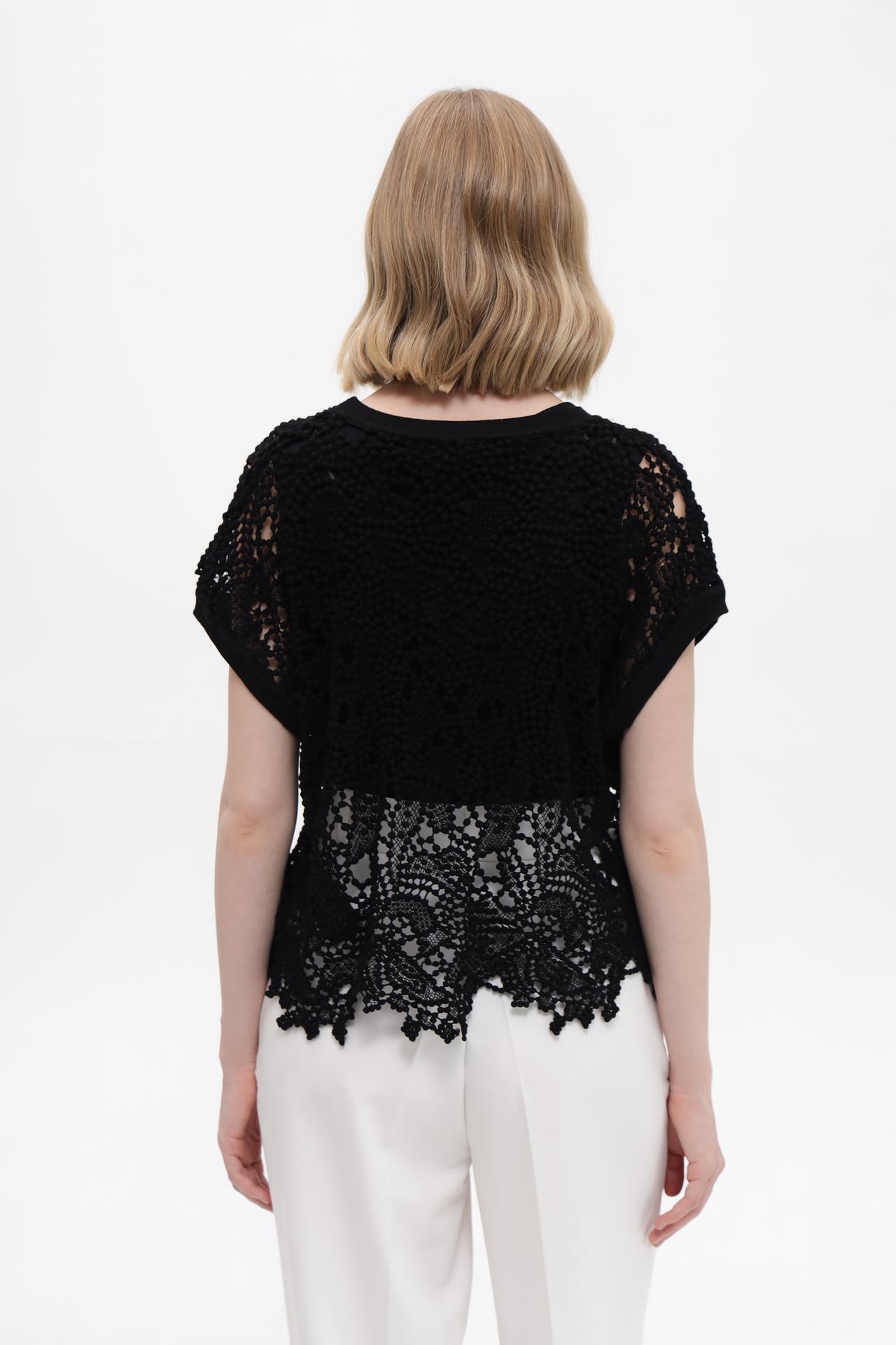 - Дизайн: Кроп-топ с коротким рукавом и эффектной кружевной отделкой по нижнему краю. Кружевные элементы расположены также на плечах и спине, создавая легкий и воздушный силуэт.