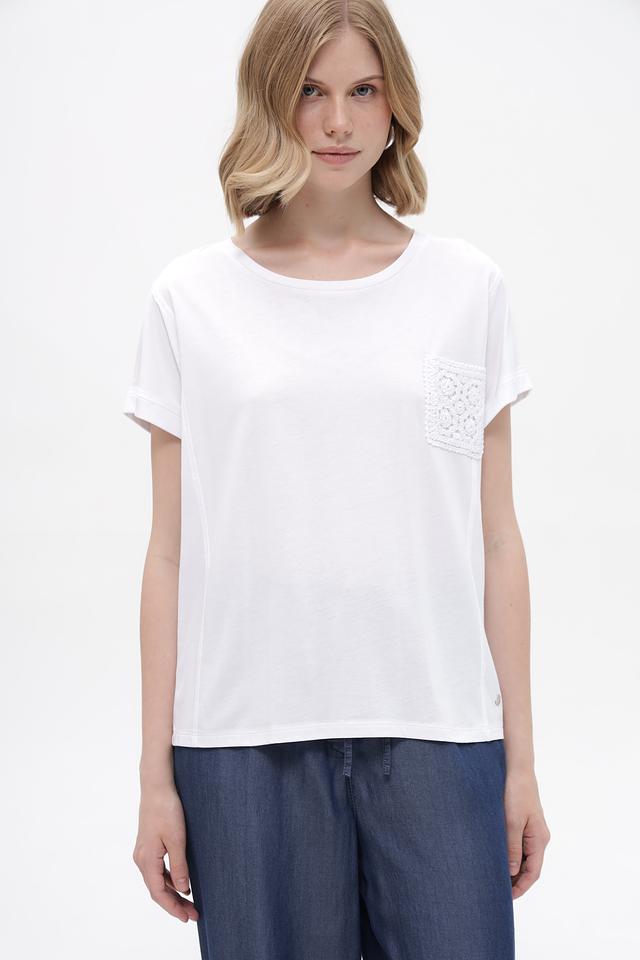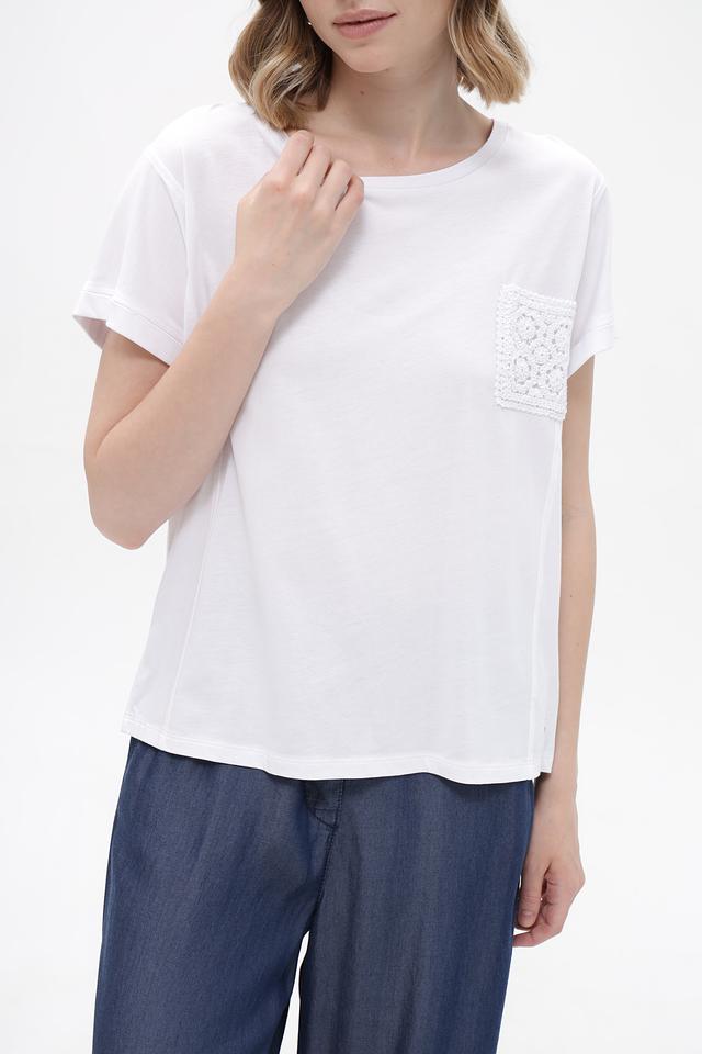 Белая футболка Monari из хлопка и модала с декоративным кружевным карманом. Удобный крой и натуральный состав обеспечивают комфорт в течение дня. Состав: хлопок 50%, модал 50%